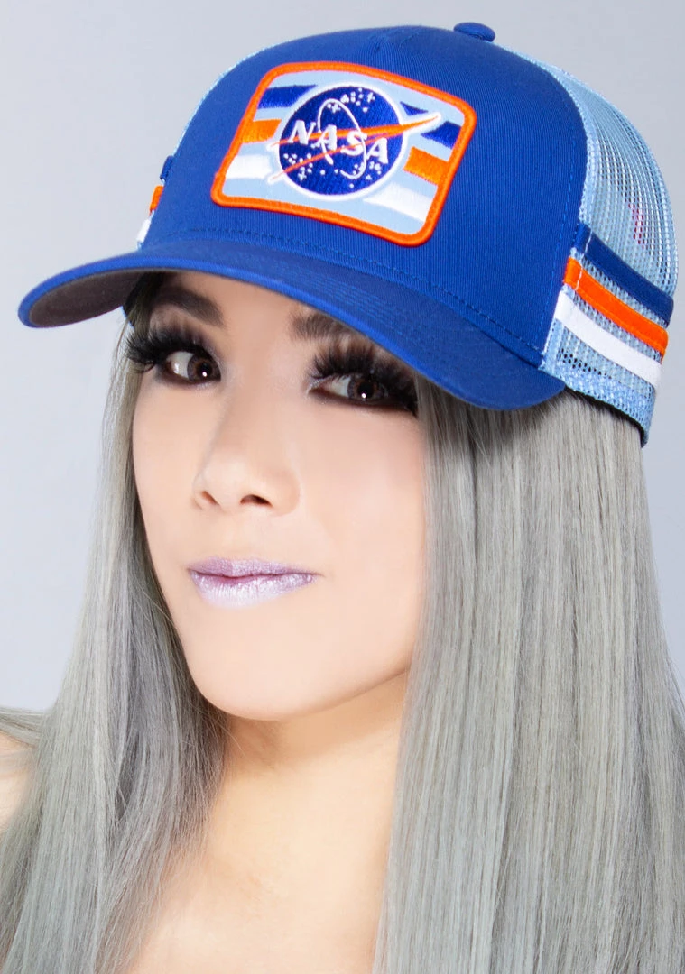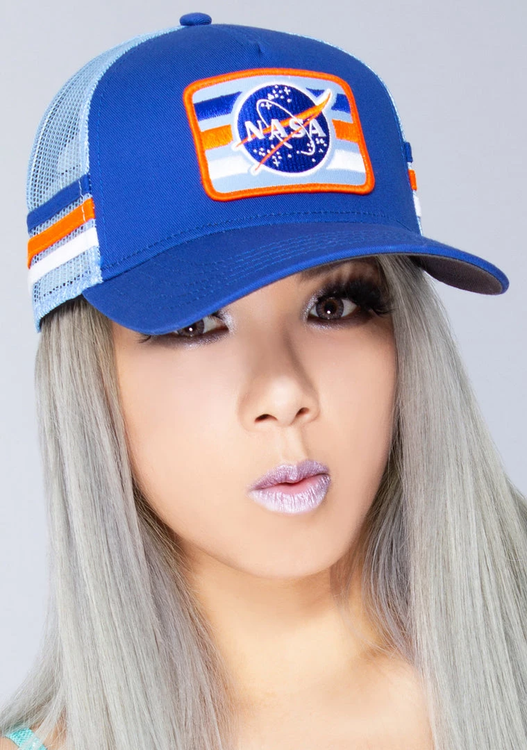 Show your love for the galaxy with the NASA Triangle Color Hat from American Needle. This totally stellar festival accessory features a blue cap and bill, mesh side and back paneling, striping detail on the mesh, adjustable plastic back strap, and embroidered NASA patch logo.