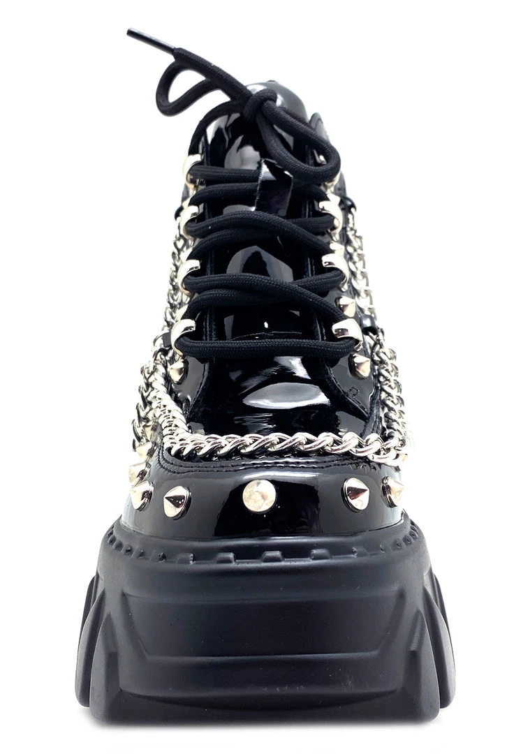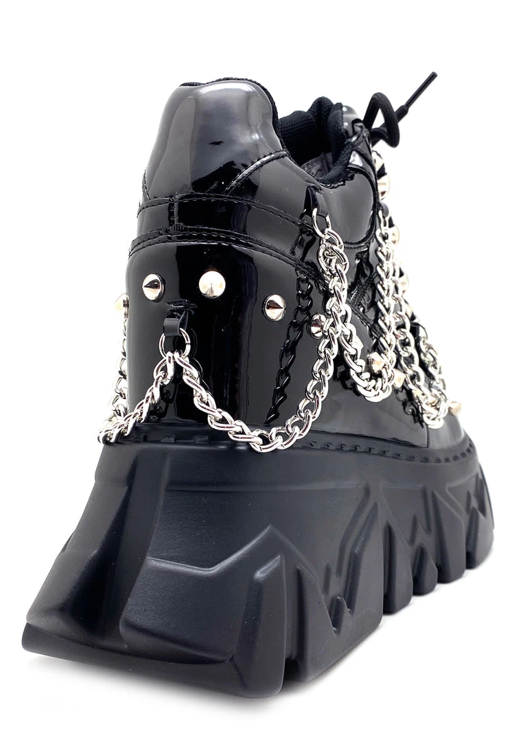 Raise a little hell with the Bad Behavior Platform Sneakers from Anthony Wang. These bad a$$ festival Platform Sneakers feature an all-black patent vegan leather outer with silver chain and stud details, lace up front, and a hidden interior wedge that puts you above the rest. Throw on these cute sneakers and tell them to get out of your way!