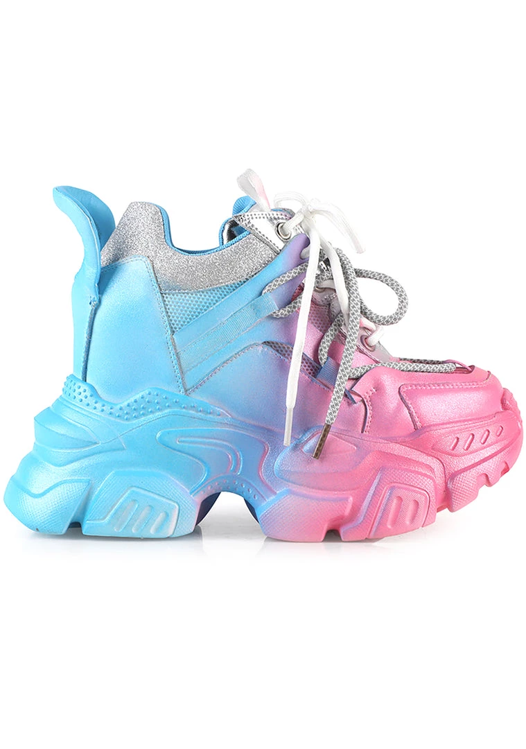 Nothing’s bringing you down when partying in these Anthony Wang High On Life Platform Sneakers. These chill festival platform sneakers feature a two-toned blue and pink hand-sprayed paint over vegan leather, mesh fabric upper, and platform sole. It’s designed with contrast sparkly trimmings, metallic silver lace-up front, and a built-in inner wedge for a hidden boost. So tell those Derek downers to get out of here with their negativity! Good vibes only!