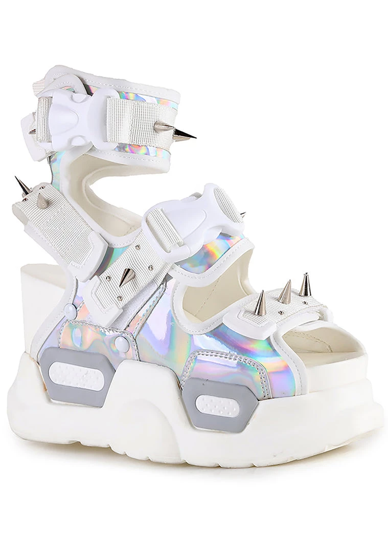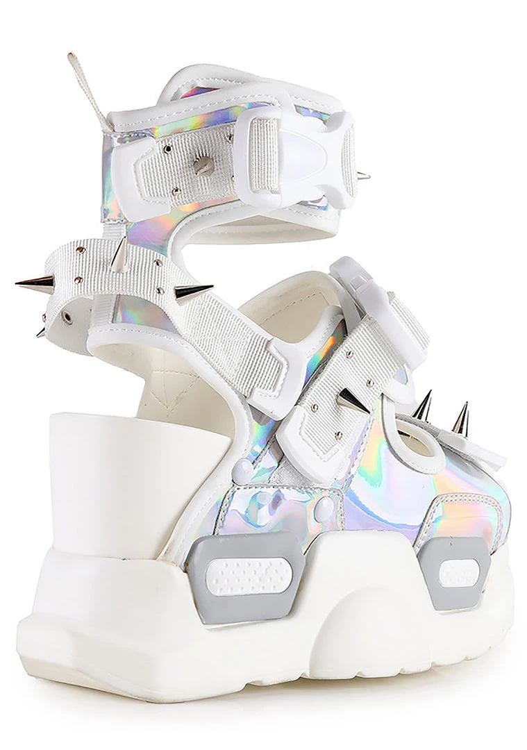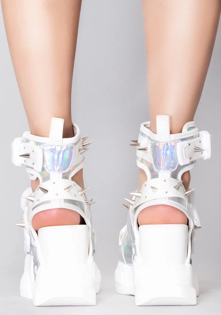 3..2..1..Hit it! Take Off to a new bad a$$ world with the Hyperspace Platform Sandals from Anthony Wang. These cyberpunk platform festival sandals feature white multi strapped upper with holographic contrast details and silver spike accents, clip buckle closures, major traction sole for comfort, and flexible wedge platform heel. Throw on these cute sandals and take a giant step for boss babe kind!
