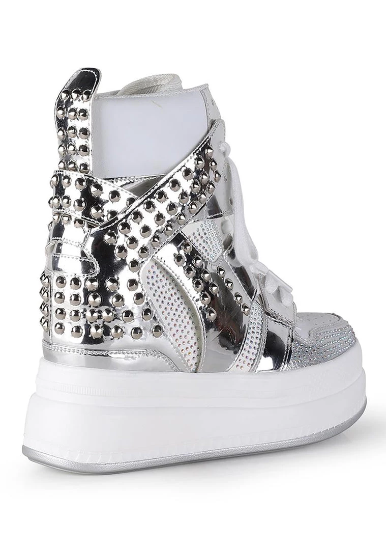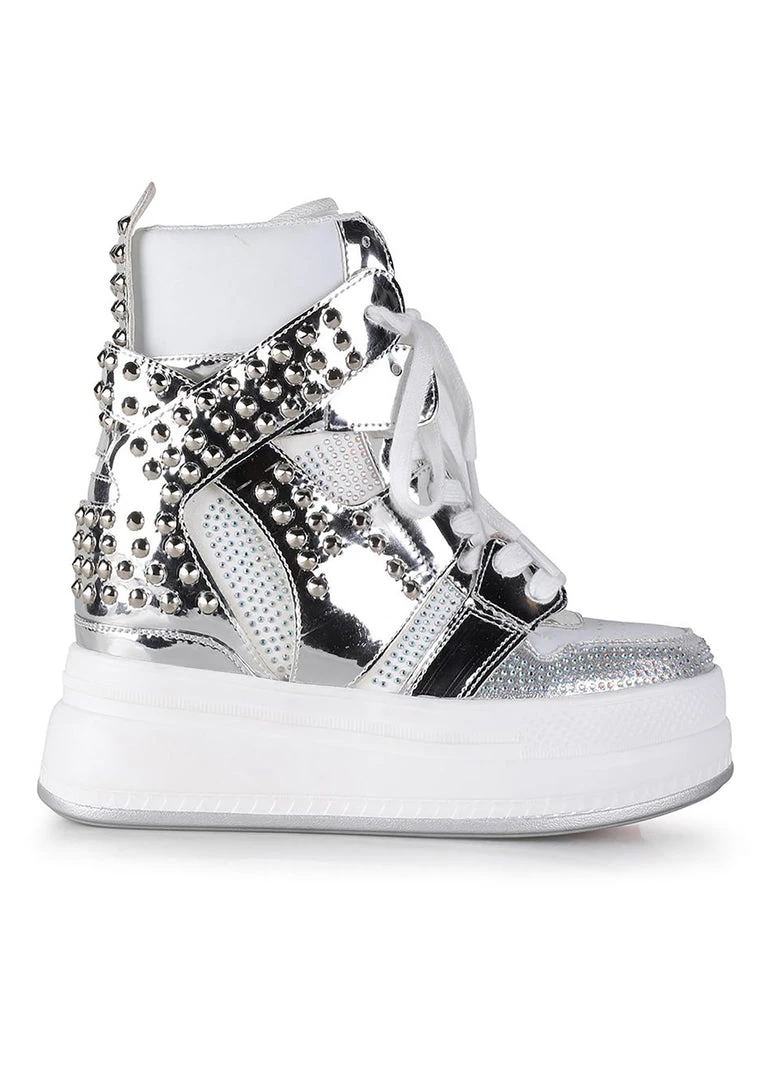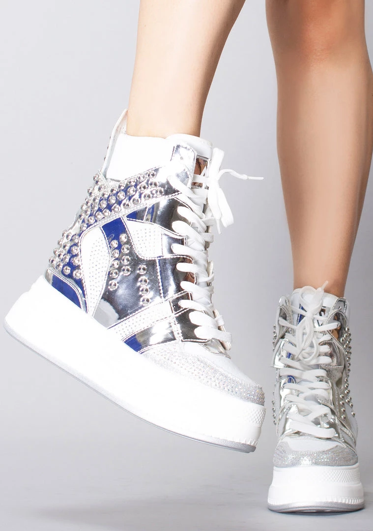 You’ll be unforgettable in the Iconic Platform Sneakers by Anthony Wang. These eye-catching platform sneakers feature a white and silver vegan leather rhinestone-encrusted upper, lace-up front, silver stud details, hidden interior wedge heel, and a platform sole that’s sure to make a statement without you even saying a word.