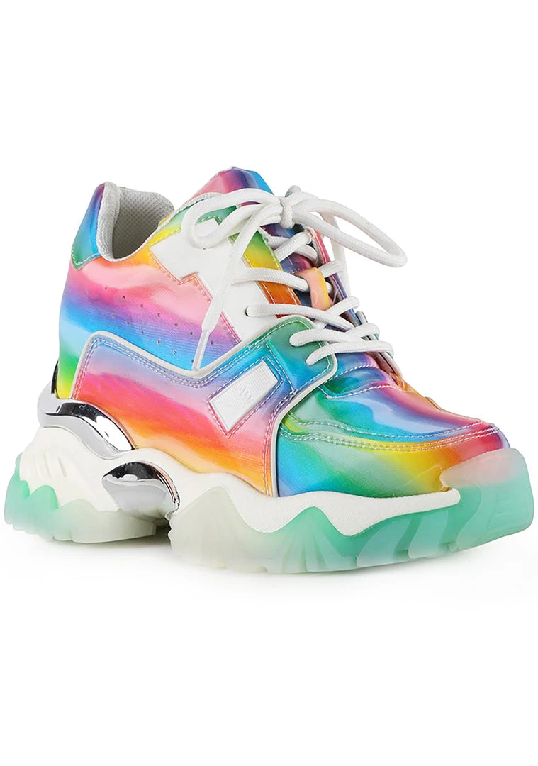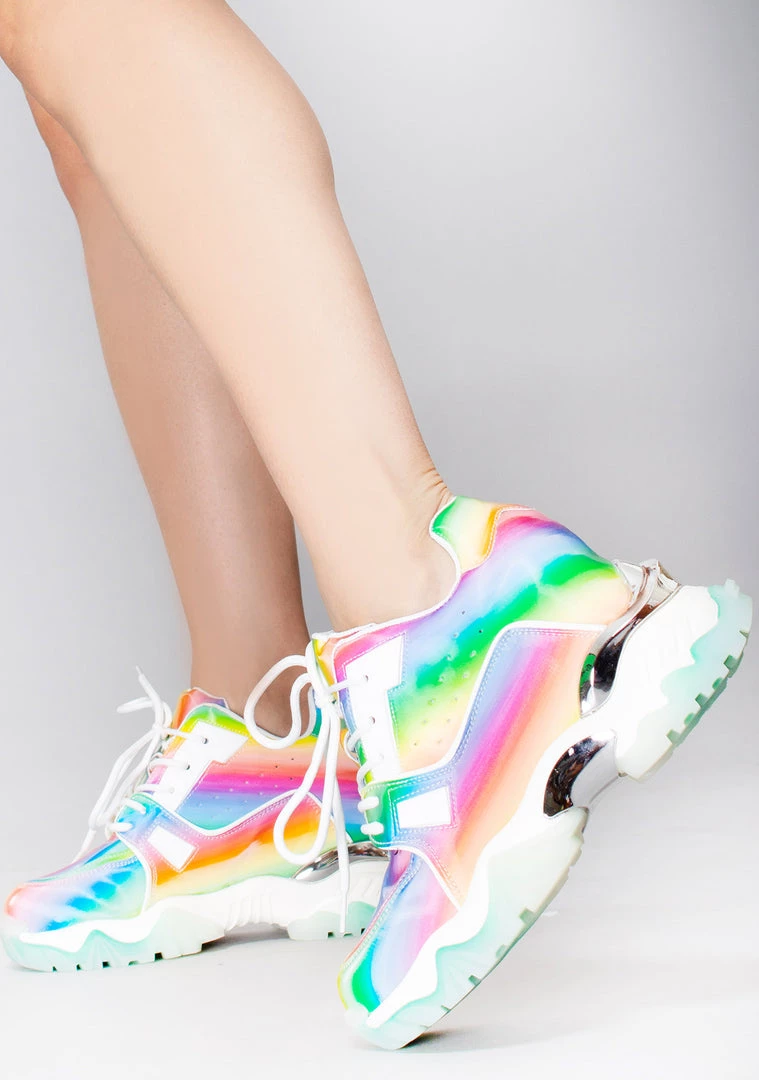 Enter the trance with the Full Spectrum Platform Sneakers from Anthony Wang. These vivid festival platform sneakers feature a mesmerizing lenticular rainbow upper, ombre turquoise bottoms, lace up front, and hidden interior heel that will elevate you to the next level. Throw these cute rave sneakers on and let yourself go.