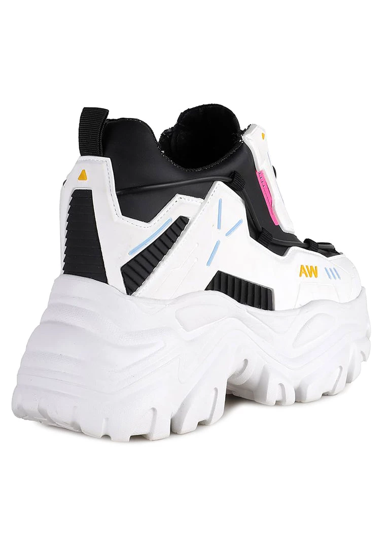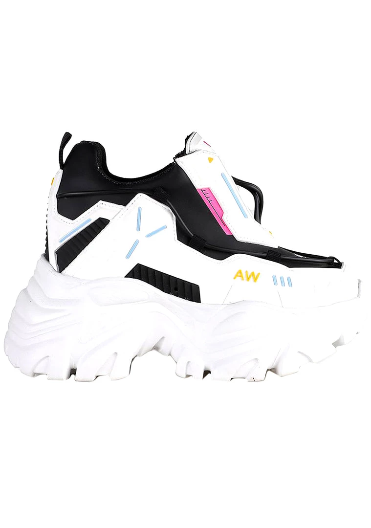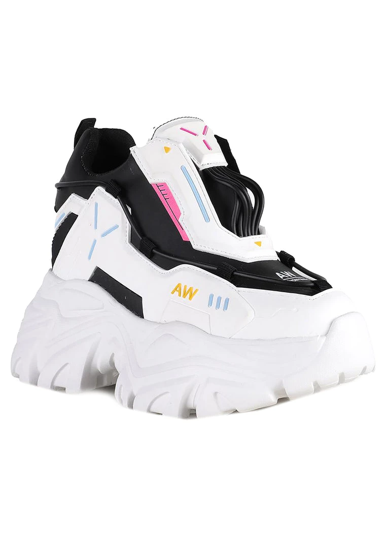 Fight for the new world in the Neo Genesis Platform Sneakers from Anthony Wang. These new-age festival platform sneakers feature a black and white vegan leather upper with PU cable and embossing details, an easy slip-on style, chunky tread bottoms, and cushioned hidden heels. It’s a new dawn and with these cute sneakers, they’ll follow you to victory.