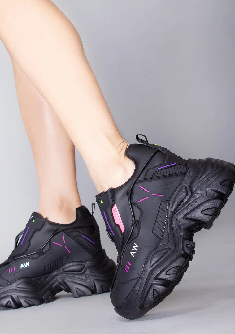 Plugin and upload your mind with the X Machina Platform Sneakers from Anthony Wang. These top-of-the-line festival platform sneakers feature an all-black vegan leather upper with PU cable and embossing details, an easy slip-on style, chunky tread bottoms, and cushioned hidden heels. If you long to never die Baby, plugin, upload your mind.