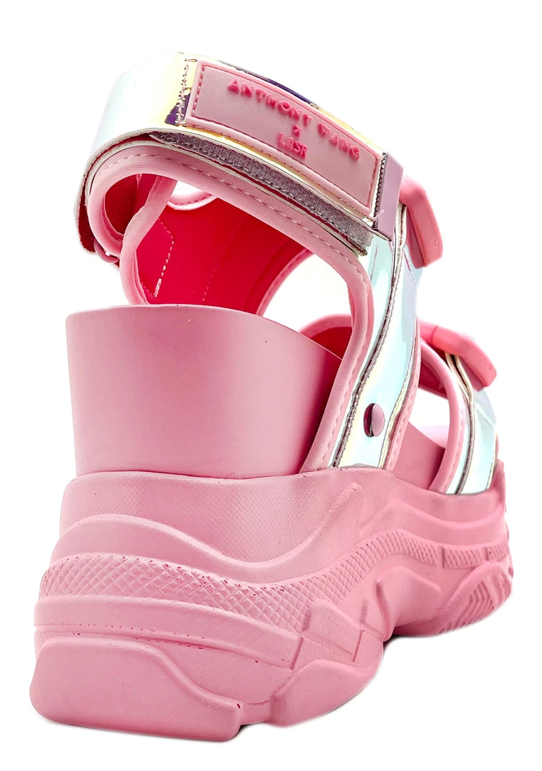Bring glam to the dance floor with the LASR Exclusive Electric Barbie Platform Sandals from Anthony Wang. These ultra hot festival sandals feature a pink breathable padded mesh upper with multiple daring snap buckle closures, Iridescent contrast details, matching flexible foam wedge platform insole, and a major traction outsole. #2hot4you