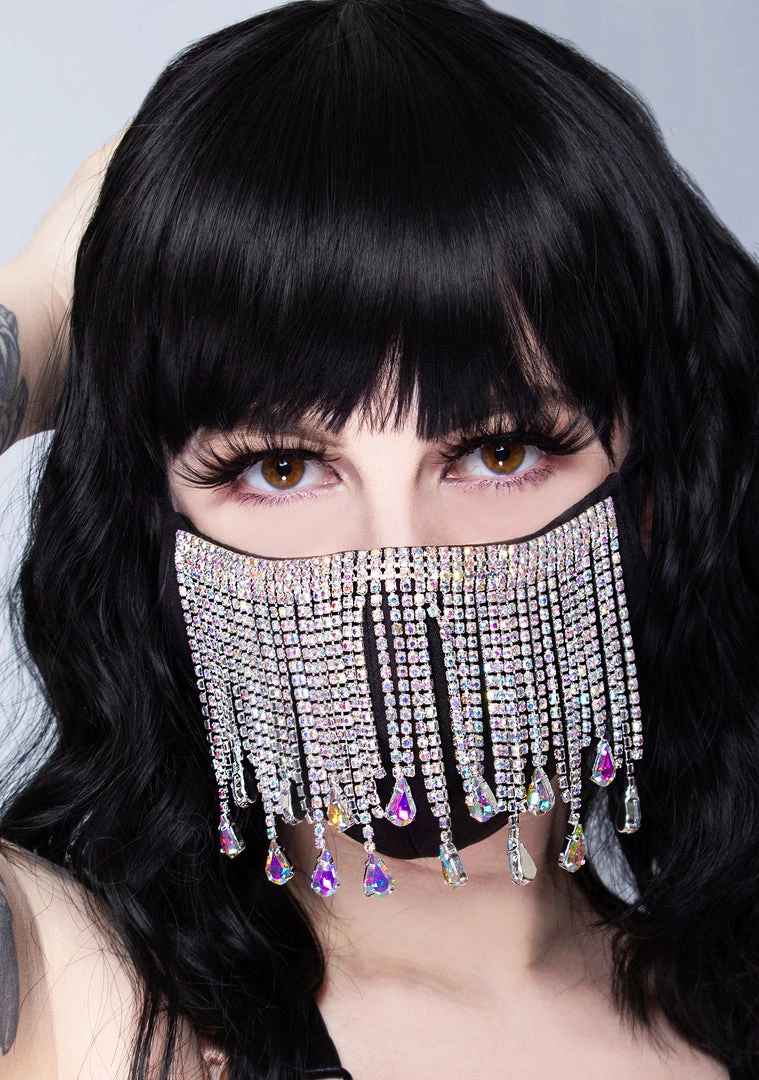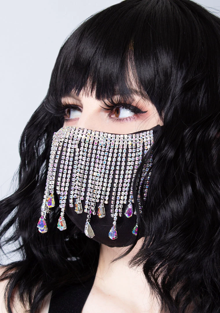Attract the attention you deserve in the new Diamond In The Rough Dust Mask from Azalea Wang. This glam festival accessory features a black cloth face covering with dangling rhinestone, gemstone detailing, and it’s lined with an inner pocket for 2.5 PM filters. With this mask no one can dim your shine.