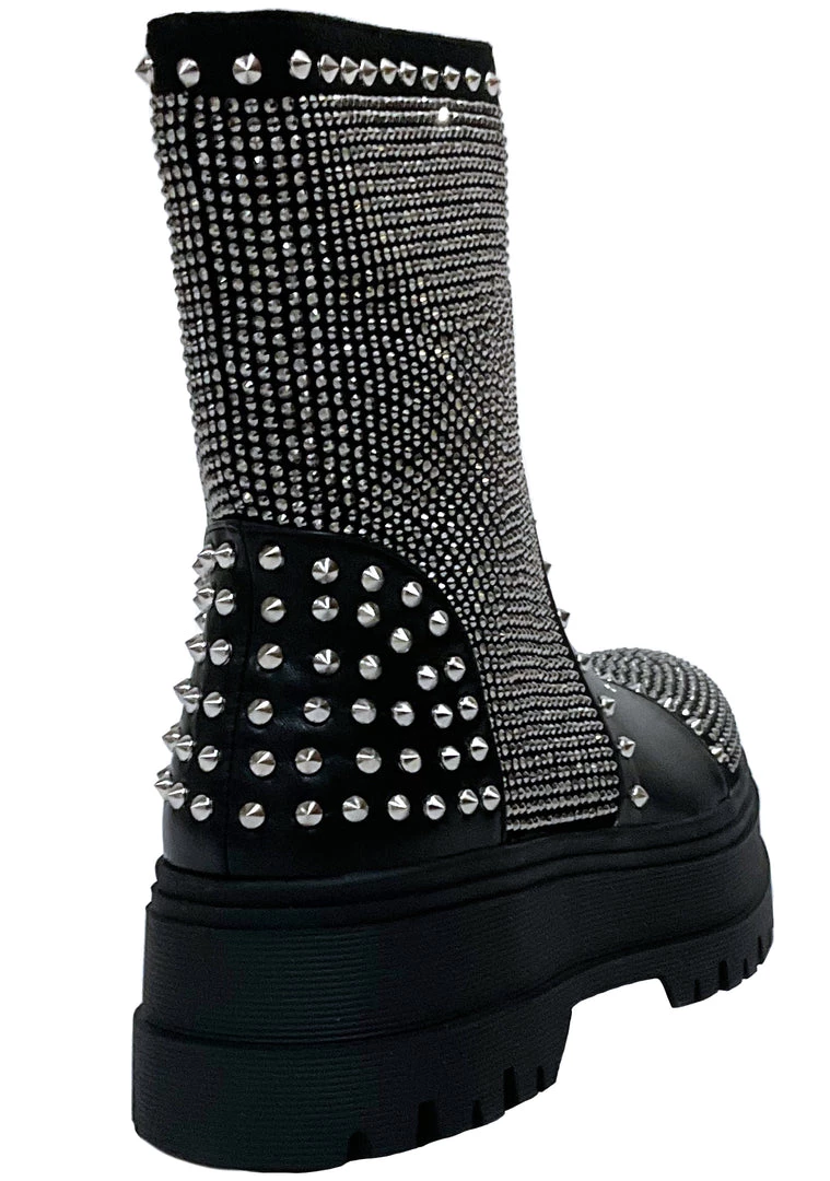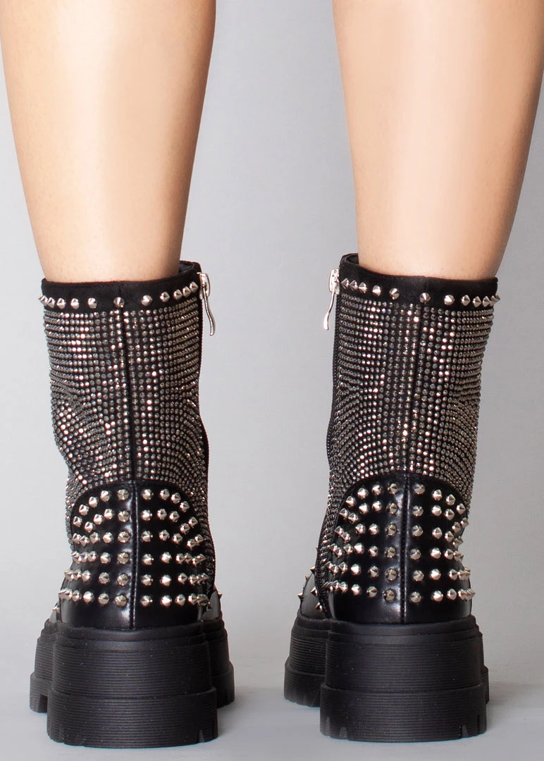 Why be a little cute when you can be a whole lot of hot with the Extra Mode Platform Boots from Azalea Wang. These fabulous festival boots feature a black vegan leather outer encrusted in rhinestones, silver stud accents, and interior zipper closure. #blingbabe