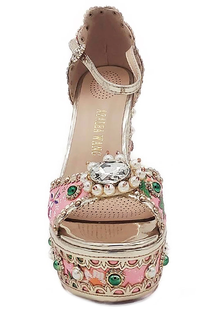 Heads will roll over the Let Them Eat Cake Platform Heels from Azalea Wang. These fab high heels for women feature a baby pink base floral upper with gold trim, and ankle strap, and are encrusted with gemstones. With these cute heels, they’ll all want a piece of you. #LetThemEatCake