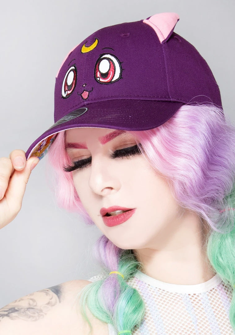 Prepare to fight evil by moonlight looking your best with the Sailor Moon Luna Cosplay Hat from Bioworld. This magical kawaii festival hats features Luna cosplay ears and embroidered face on a purple structured cap base, underbill printed artwork, and snapback closure. Throw on this cute hat and fight for love and justice!