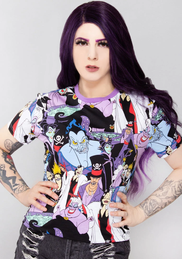 Conjure up the most evil scheme of all with the Disney Villains AOP Tee from Cakeworthy. This havoc reeking rave T-shirt features an all-over print of your favorite villainous evildoers on a soft 100% cotton tee. Not everyone wants to be a princess.
