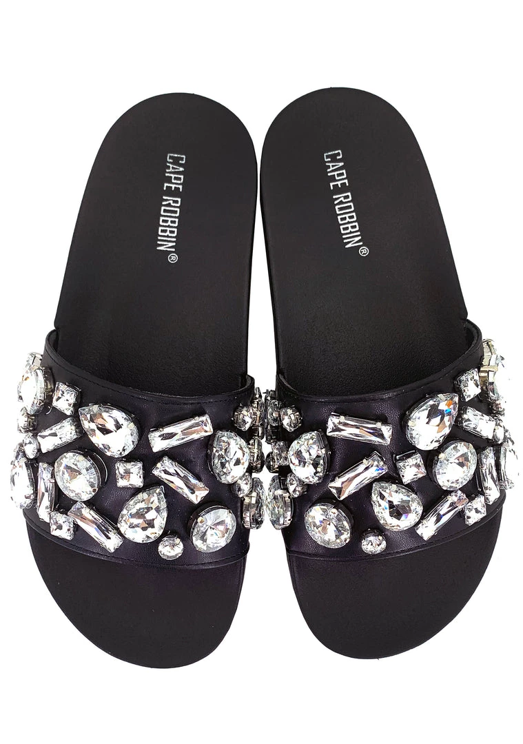 Party like a rock star in the Billionaire Bling Sandals from Cape Robbin. These bling af festival sandals features big clear stones accent on black colored upper with super comfy rubber outsole. Keep calm and bling on.