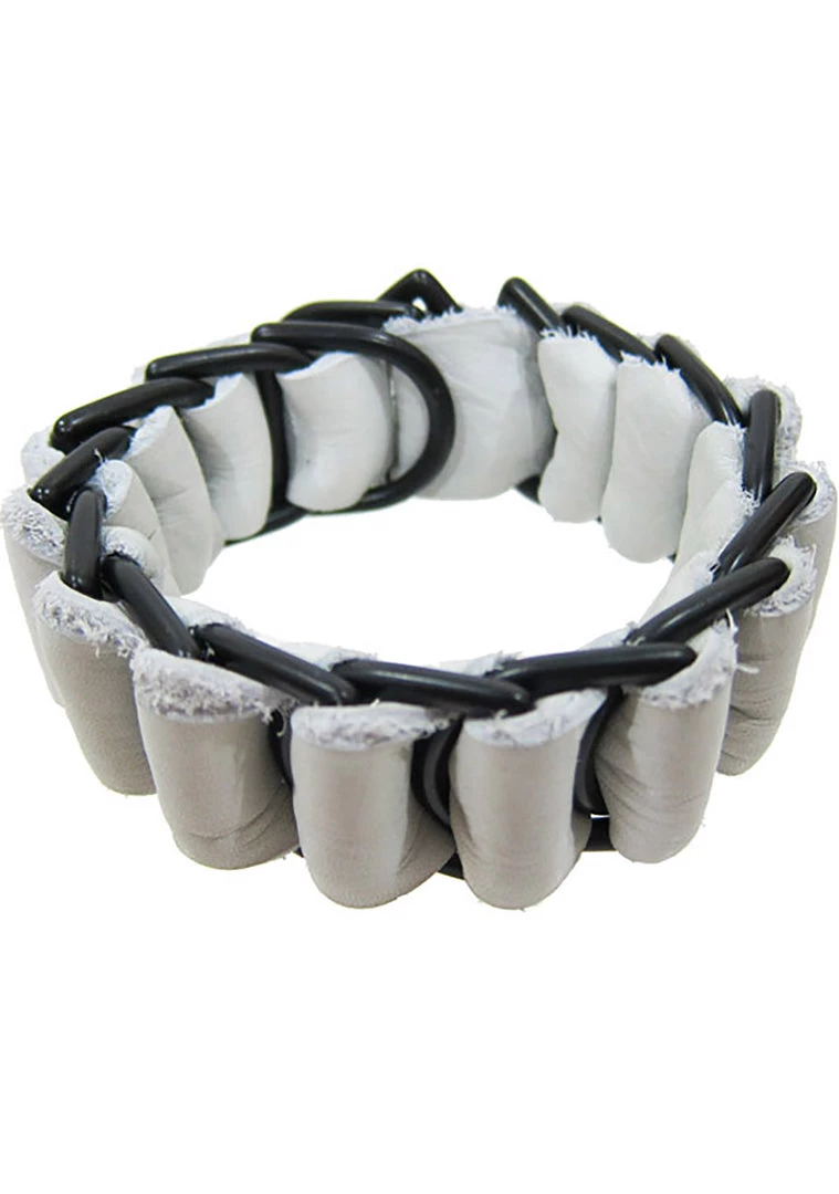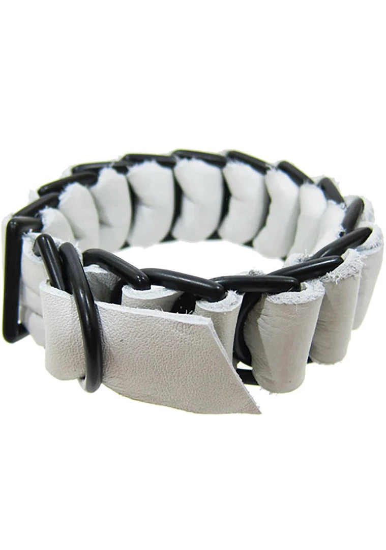 David Galan sure knows how to create the “Edgy” look! The Military leather Punk Bracelets features multiple oxidized black silver D rings braided with super soft white color cowhide leather strap.