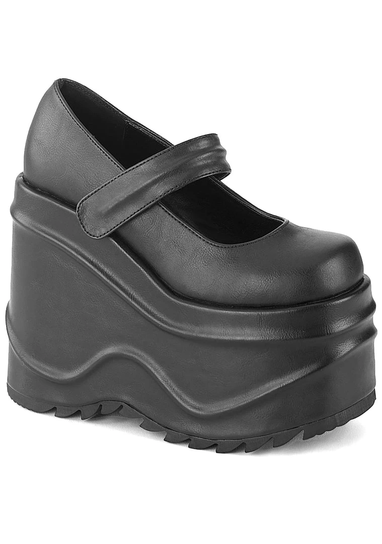 The Coven Cutie Platform heels from Demonia are wicked…wicked cute! These deadly adorable women’s high heels feature an all-black vegan leather outer, velcro strap closure, and extra high platform wedge. With these cute boots, you’ll put a spell on them and then they’re yours. Â