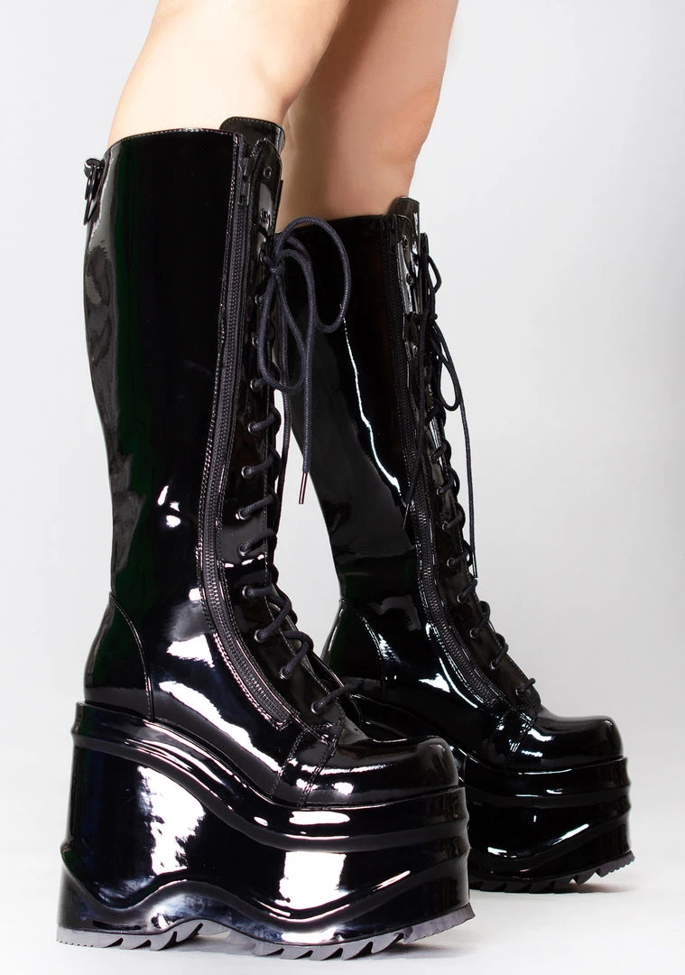 Even the dead can dance with the Dark Wave Platform Boots from Demonia. These wicked festival boots feature an all-black patent vegan leather upper, wedge platform sole, lace-up front, metal ring details, and full-length outer metal zipper. Grab these boots and lose control again.