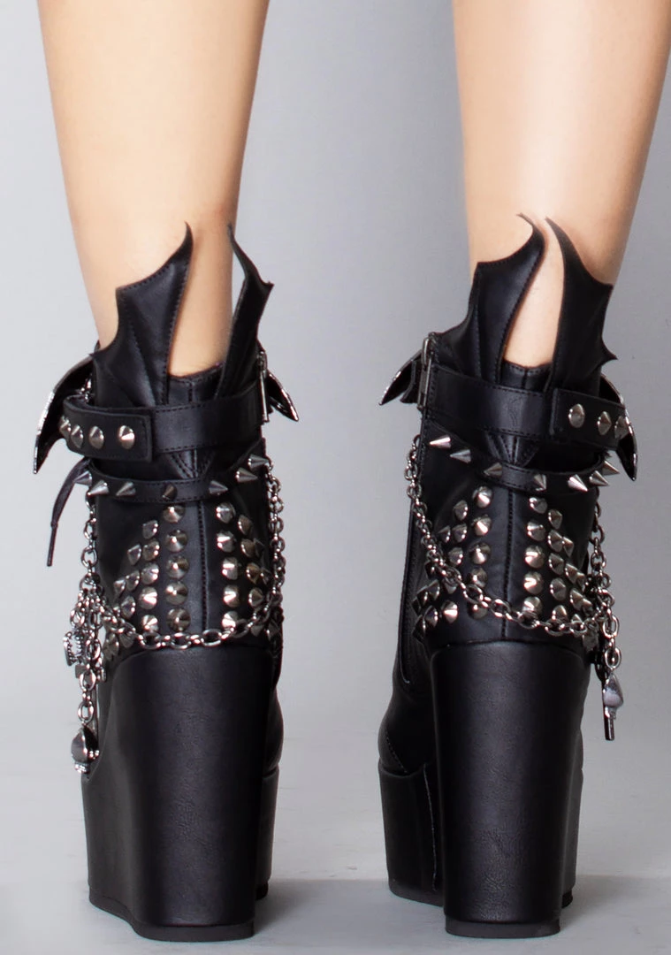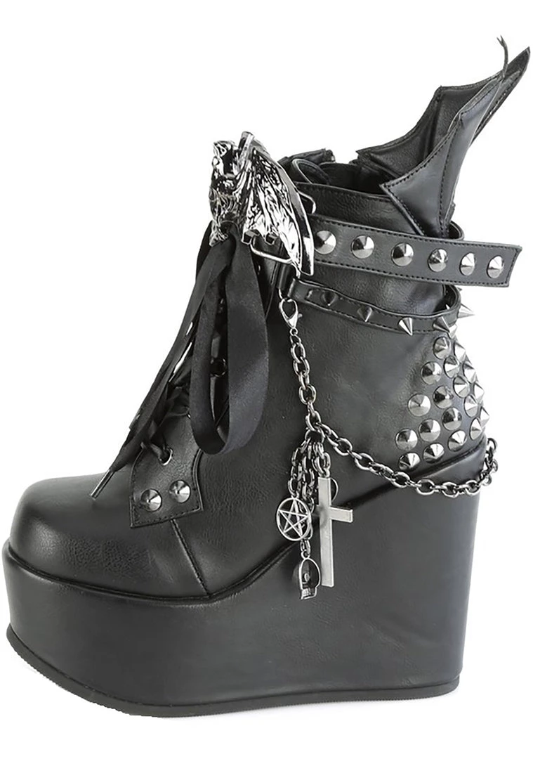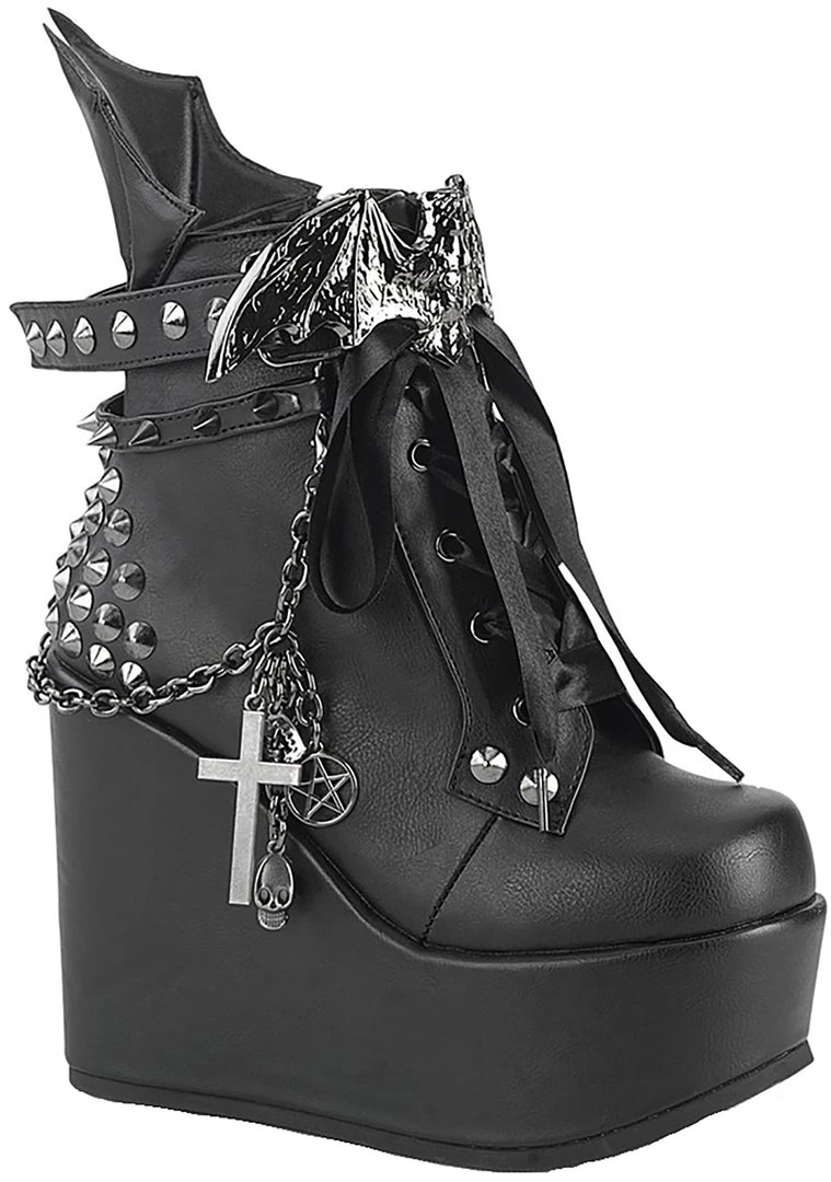 Rule the creatures of the night with the Fang Fatale Platform Heels from Demonia. These sinfully fabulous women’s high heels feature an all-black vegan leather upper with lace-up front, bat ankle cut details, stud and charm accents, appliqué wing ankle embellishments, and interior zipper closure. With these cute heels, it’s going to be a bloody good reign!