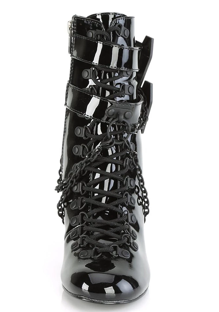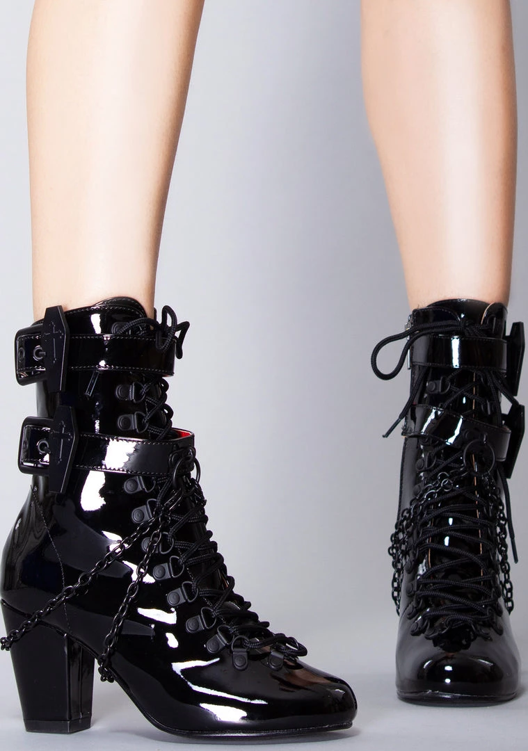 Prepare for your descent to the other side with the Final Service Ankle Boots from Demonia. These soul-stealing festival boots feature a black vegan patent leather upper with corset style lace-up front, double ankle straps with metal coffin buckle, removable chain accents, and interior zipper closure. With these cute boots, you’ll enter the afterlife in style.