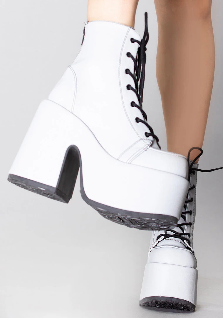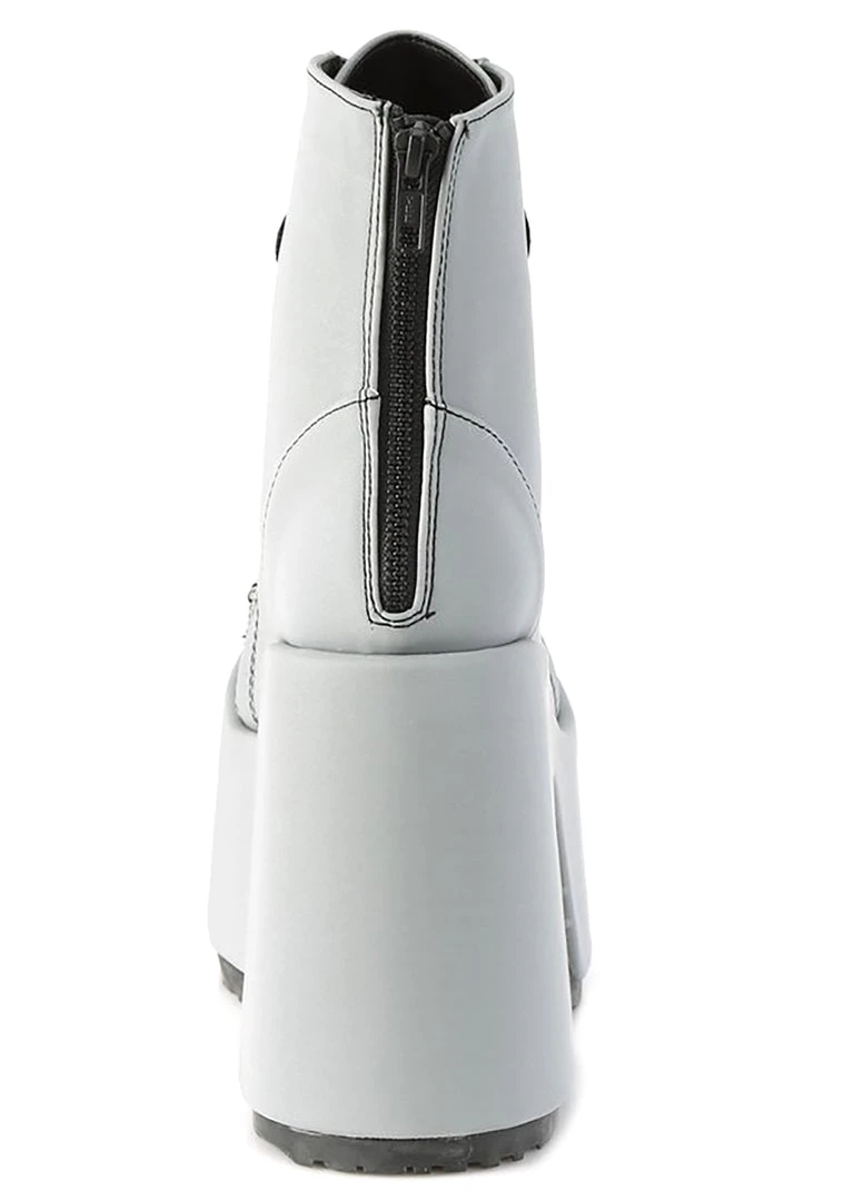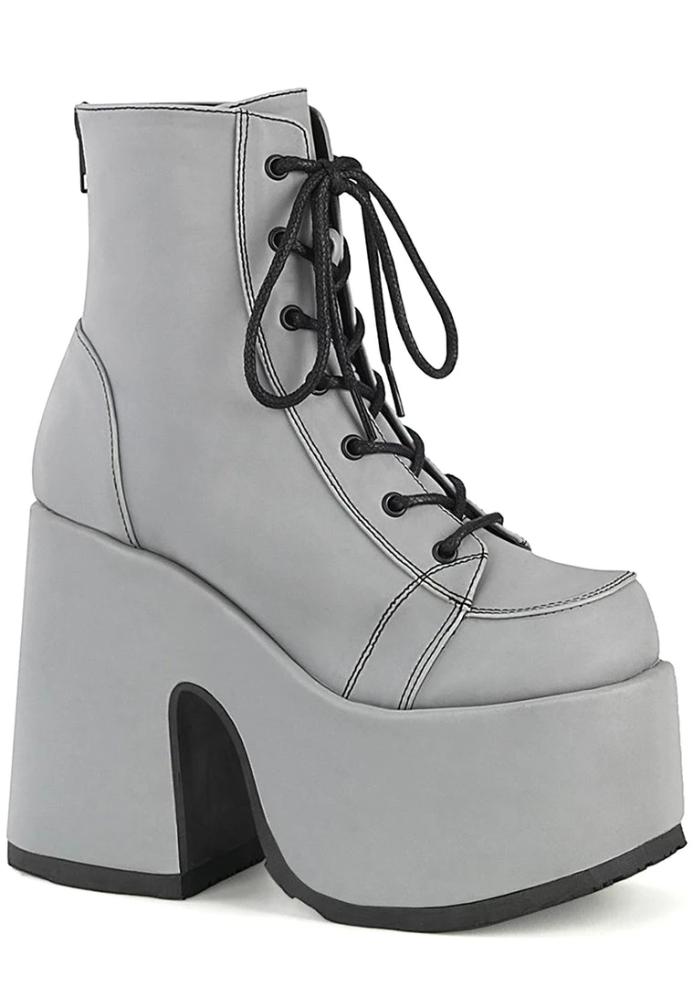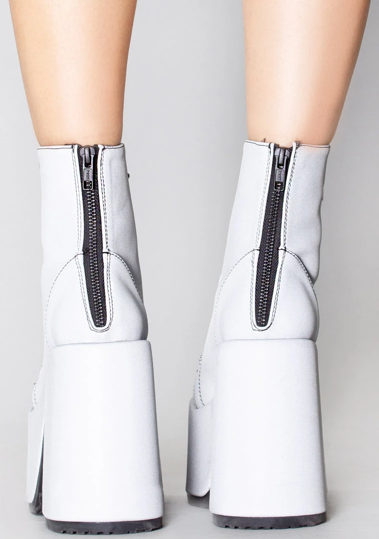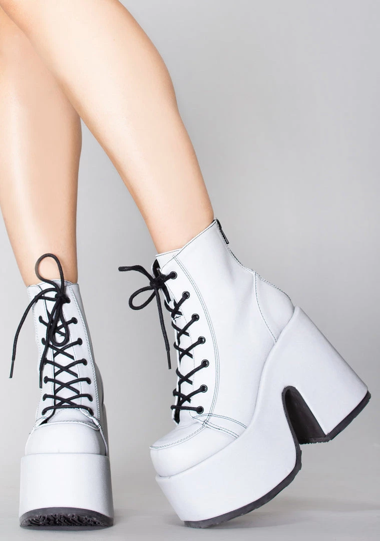 Step into the room with a BANG with the Flash Bomb Platform Boots from Demonia. These stunning festival boots feature a full-on reflective vegan leather upper, lace up front, and interior zipper closure. With these cute boots, all eyes will be on you!Â