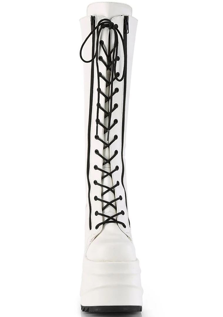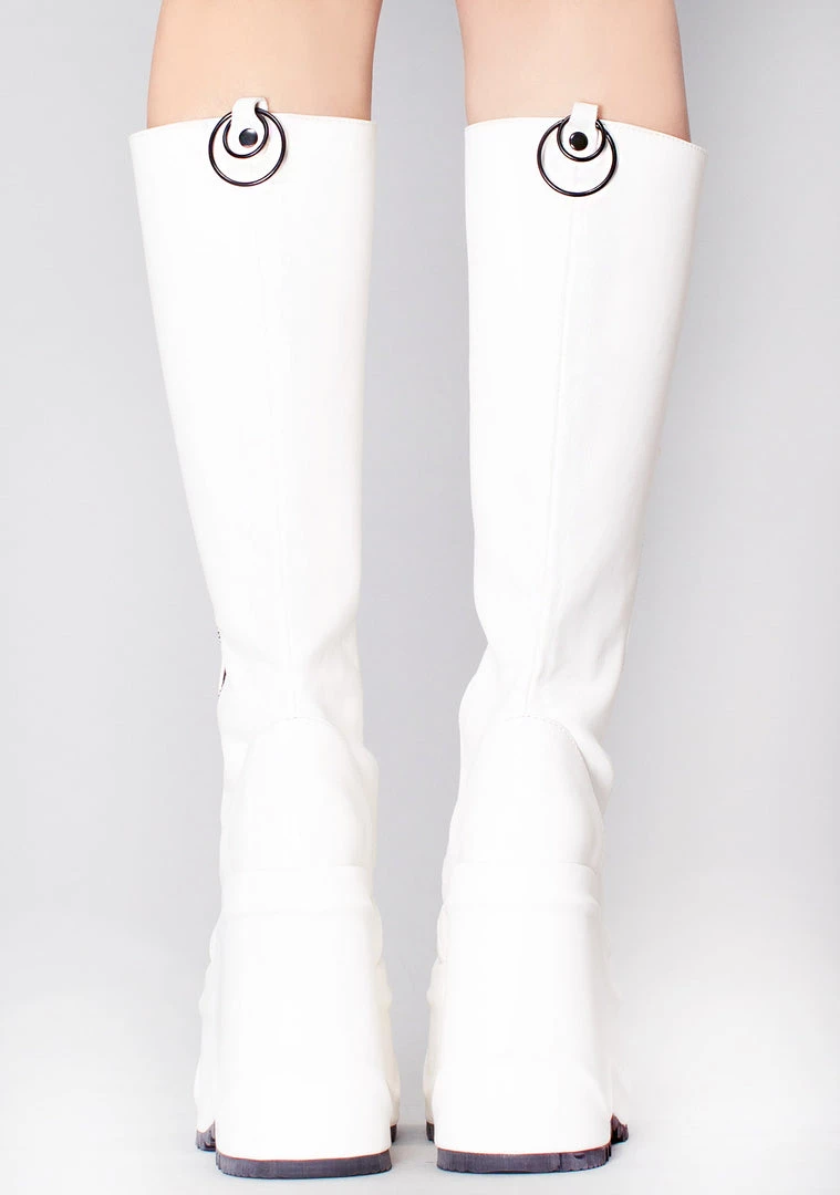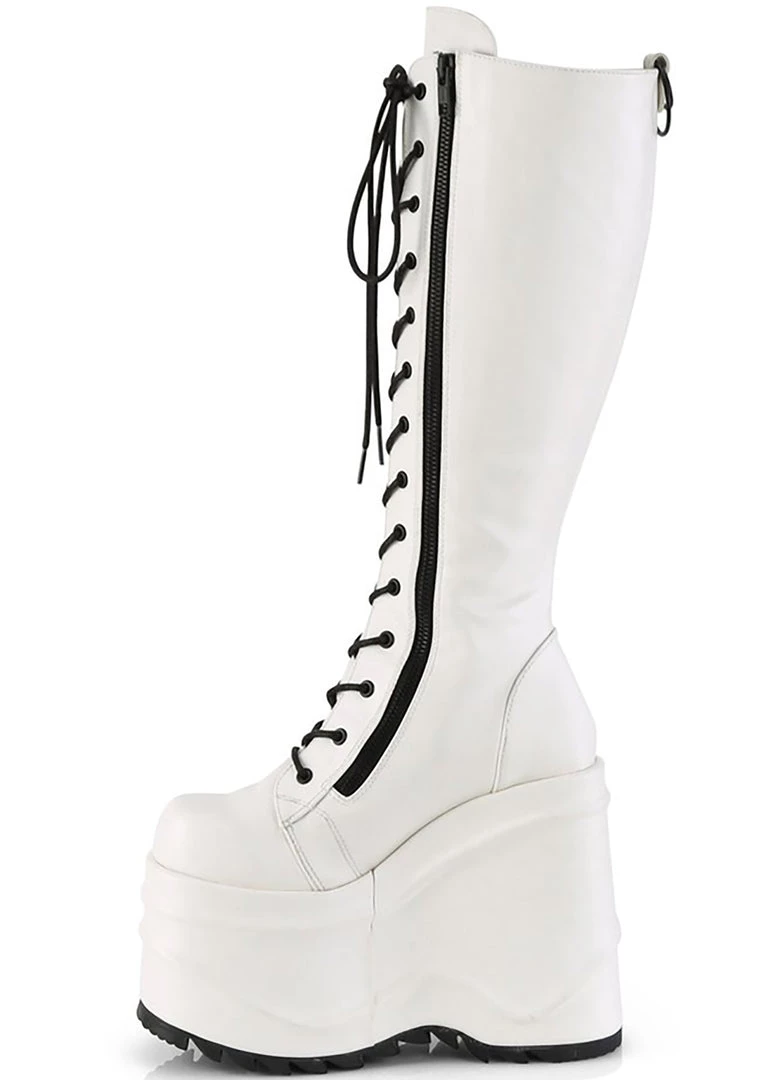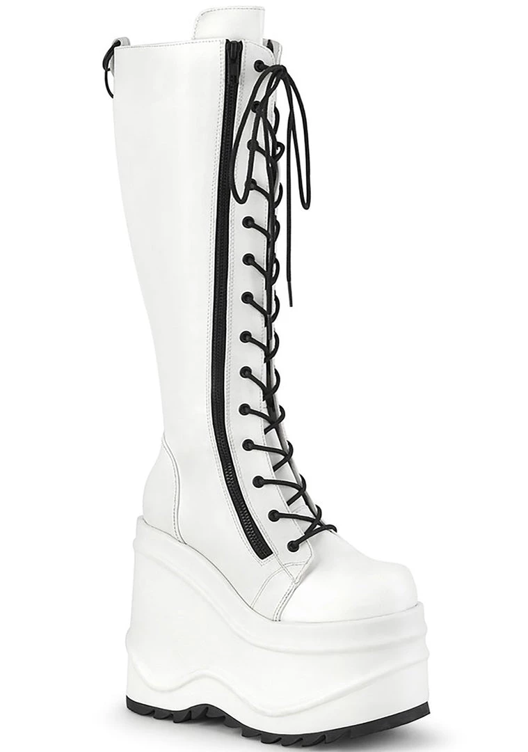 Follow the white light in the Last Breath Platform boots from Demonia. These heart-stopping festival boots feature an all-white vegan leather upper, wedge platform sole, lace-up front with contrast black laces, metal ring details, and full-length outer metal zipper. Welcome to the other side.