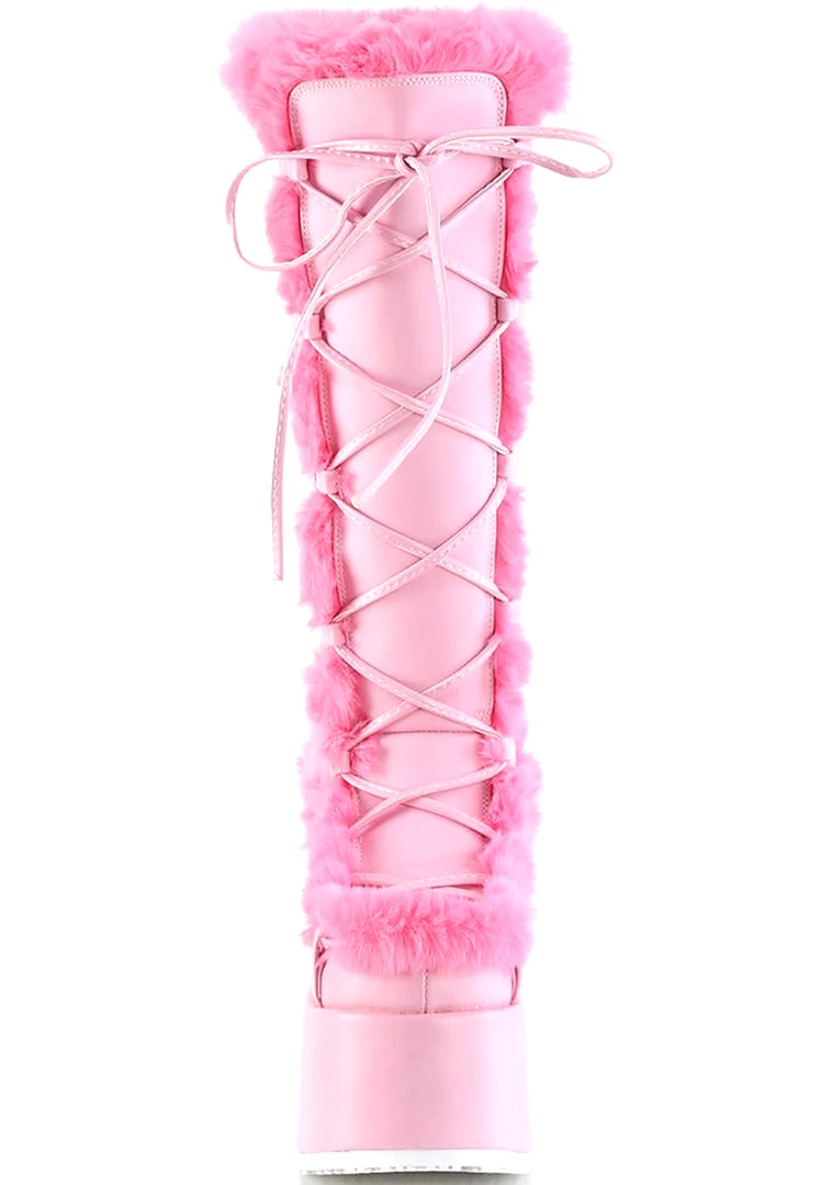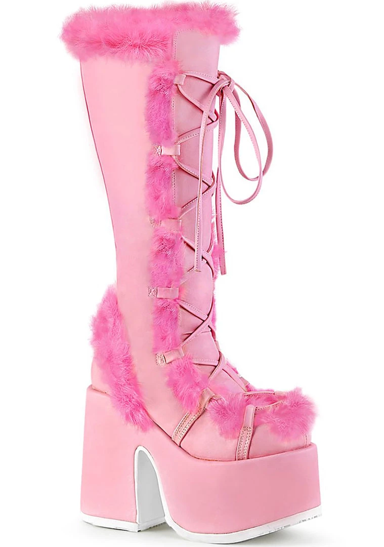 You’ll be a love monster with the Mad About You Platform Boots from Demonia. These ferociously cute festival boots feature a pink vegan suede outer, hot pink contrast faux fur lining, lace-up front, interior zipper closure, and 5″ heel. When you want them nothing will stand in your way.