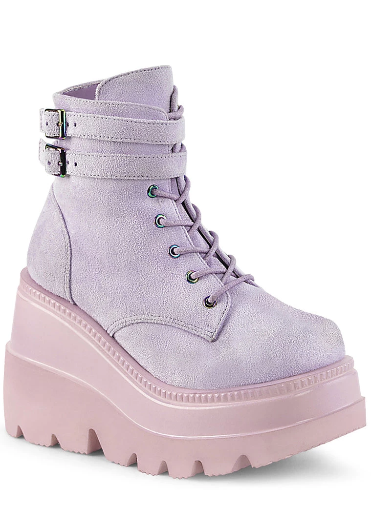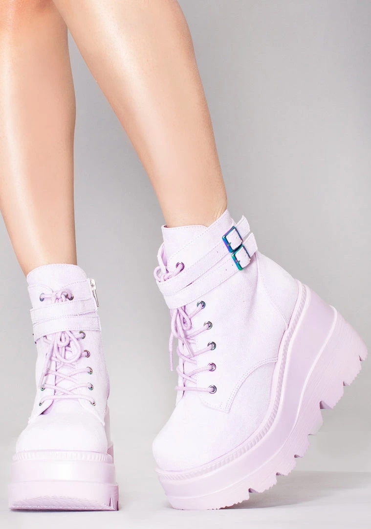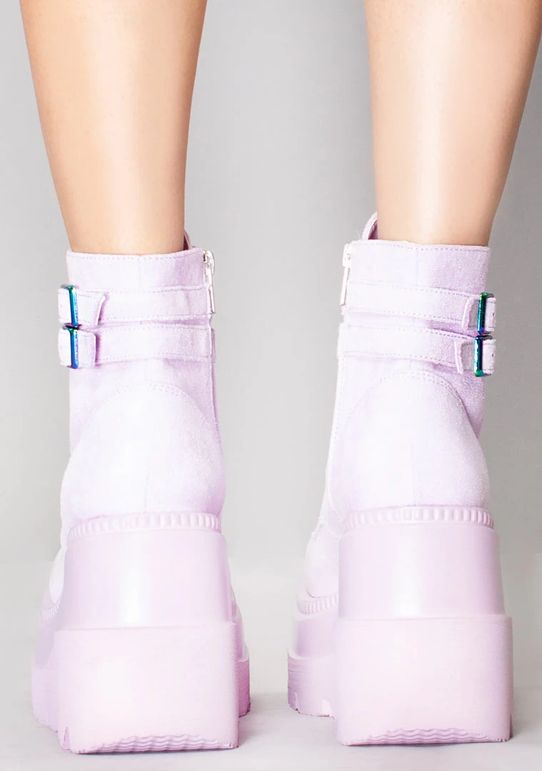 Good girls may go to heaven, but bad girls have more fun with the Miss Behave Platform Boots from Demonia. These bratty festival boots feature an all lavender vegan suede upper, lace-up front, holograph hardware, strap and buckle details at the ankle, and interior zipper closure. Throw on these cute boots and Trouble will be your middle name.