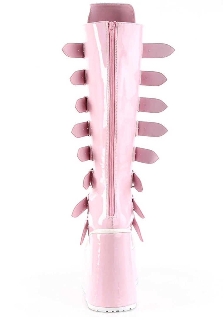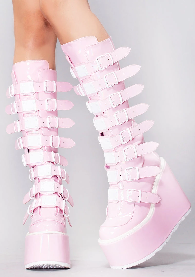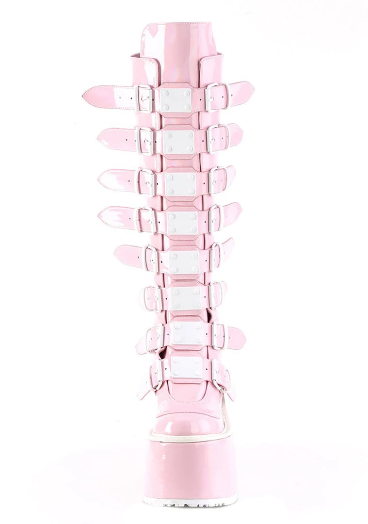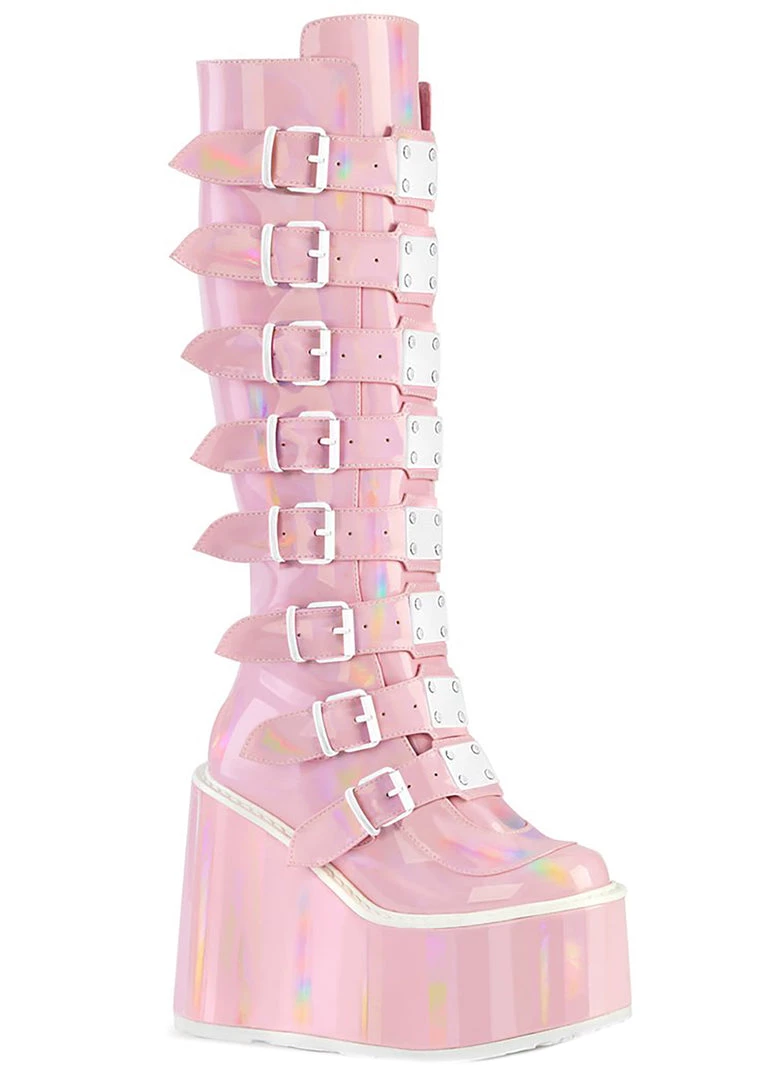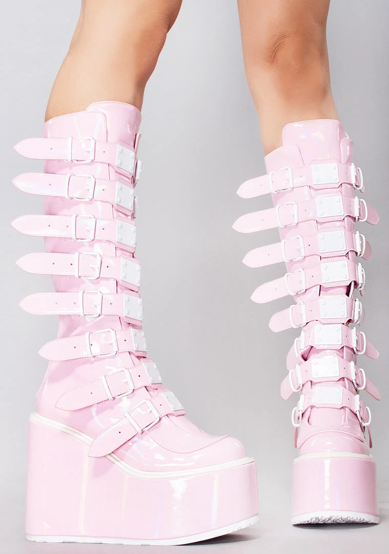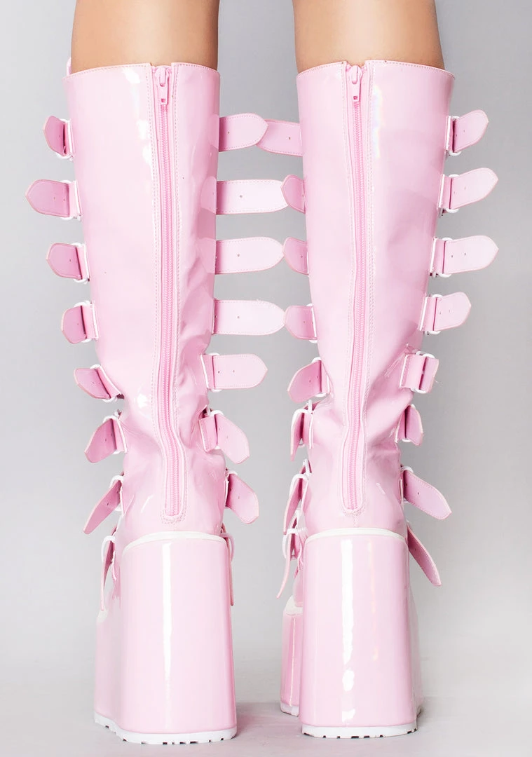 Senpai will definitely know who you are with the Notice Me Platform Boot from Demonia. These obnoxiously cute festival boots feature a holographic pink vegan patent leather upper, buckle upfront with 8 straps, white hardware and trim, and back zipper closure. Throw on these cute boots and UWU!