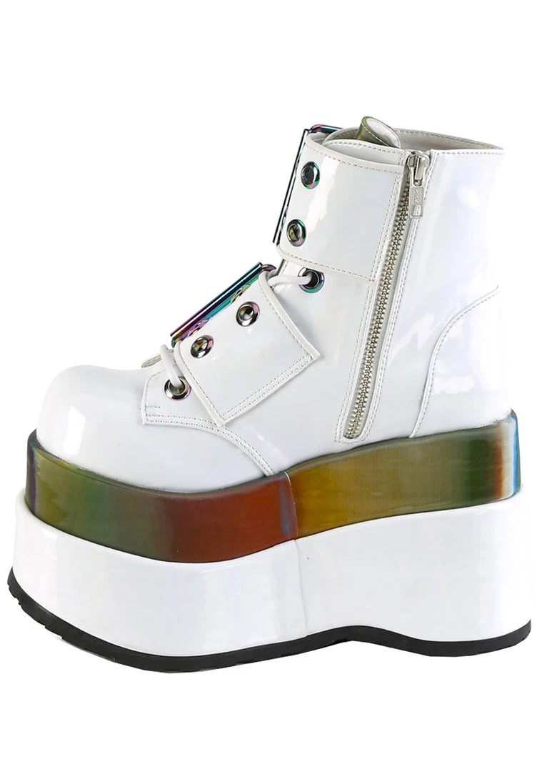 Never been to a rave? Don’t worry, we’ve got your outfit covered. The Raving Rainbow Platform Boots from Demonia is the first thing you need going to a rave. Why? Cuz it’s got the height, the looks, and it’s comfy for you to dance all day and night. These rave-ready festival boots are made with pure solid white patent faux leather contrast with rainbow lenticular panel in between, it has rainbow hardware, super thick strap closures, platform wedge heel, and major traction sole. Pop quiz. What do you wear when going to a rave?
