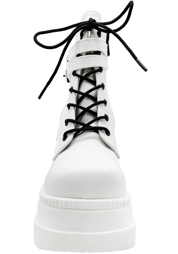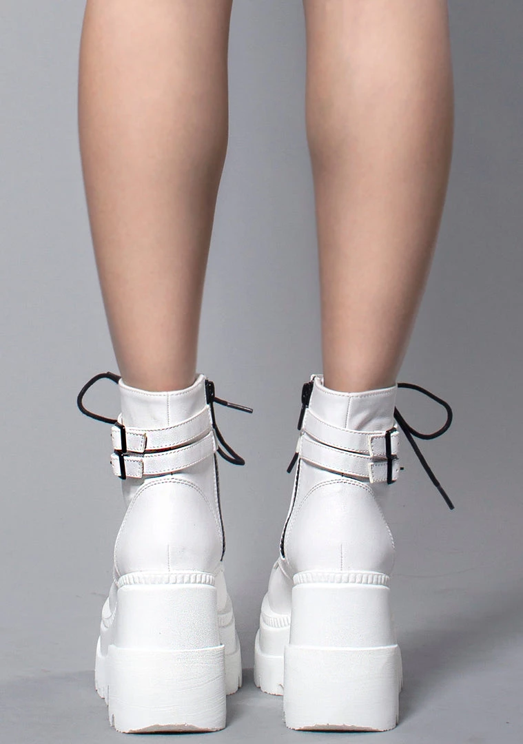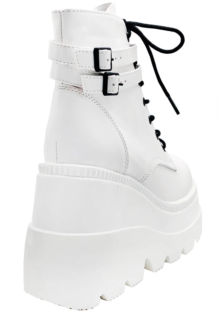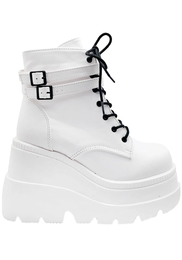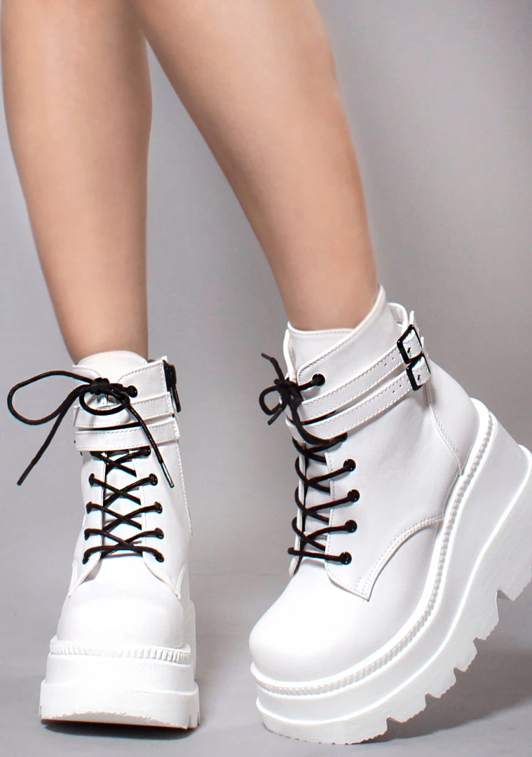 Looking nice and clean with these slick Demonia Shaker Platform Boots. These sharp-lookin white colored platform sneakers features vegan leather upper with double buckled ankle strap detail, easy lace up closure, and rubber wedge platform sole.