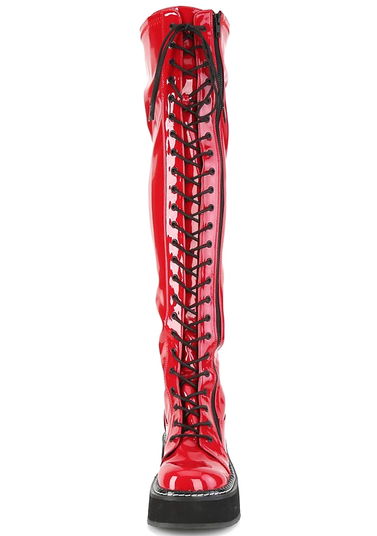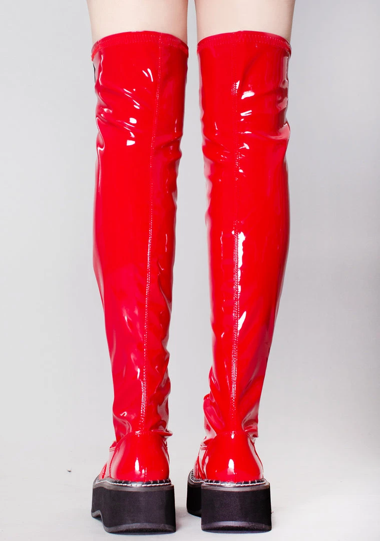 They better run and hide when you wear the She Wants Revenge Platform Boots from Demonia. These killer thigh high festival boots feature a red vegan patent leather outer, lace-up front, over the knee rise, and zipper closure up the outer side of the boot. You’re a man-eater baby!Â