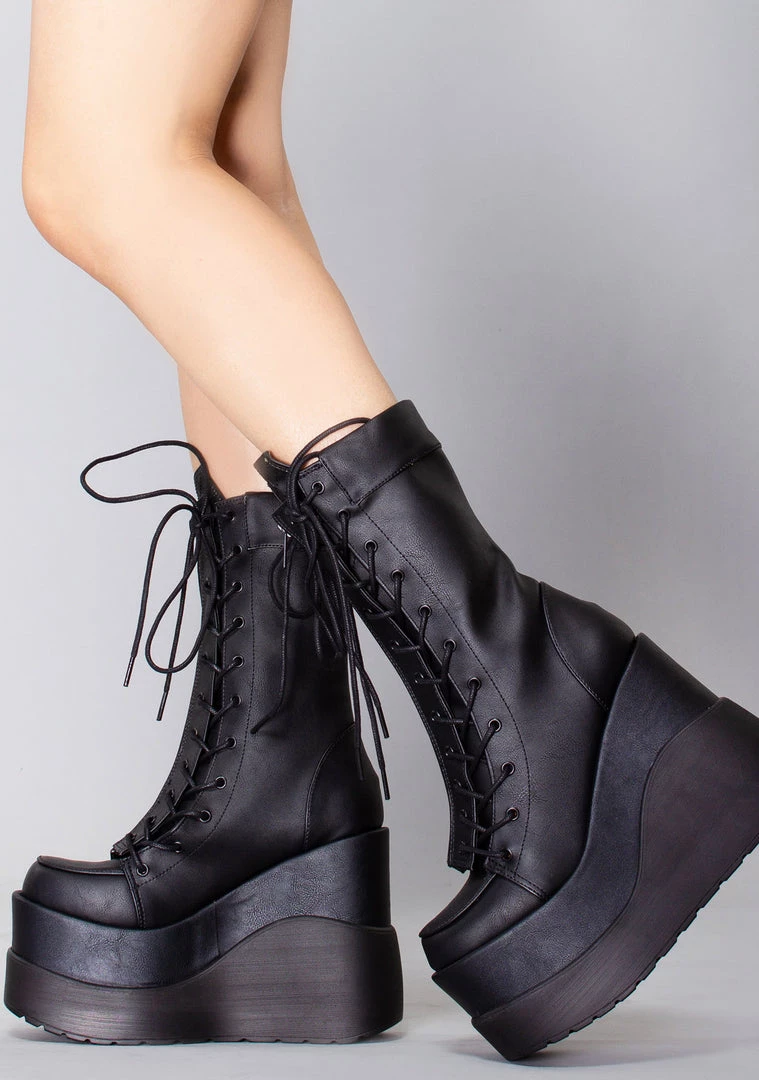 Reign in darkness with the Dead Space Platform Boots from Demonia. These totally dark festival boots feature a vegan leather upper with zipper closure up the front and dual side lace-up details. Don’t just enter the void, rule it!