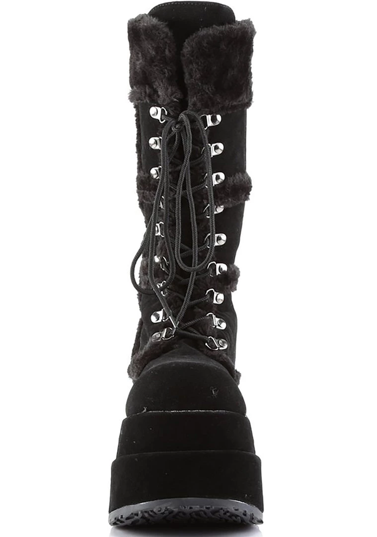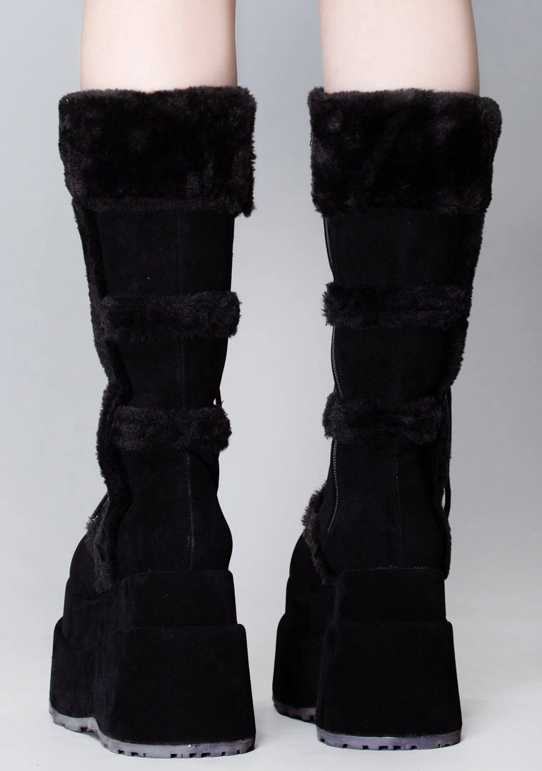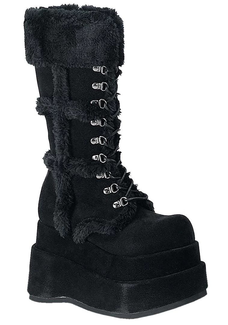 You’ll always be on their minds with the Furget Me Not Platform Boots from Demonia. These fabulous festival boots feature an all-black faux fur plush outer with shack trim detail, lace up front, and interior zipper closure. Throw on these cute boots and be the girl of their dreams.