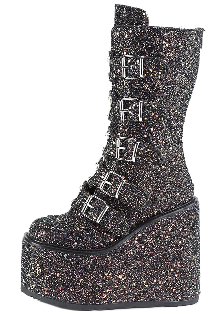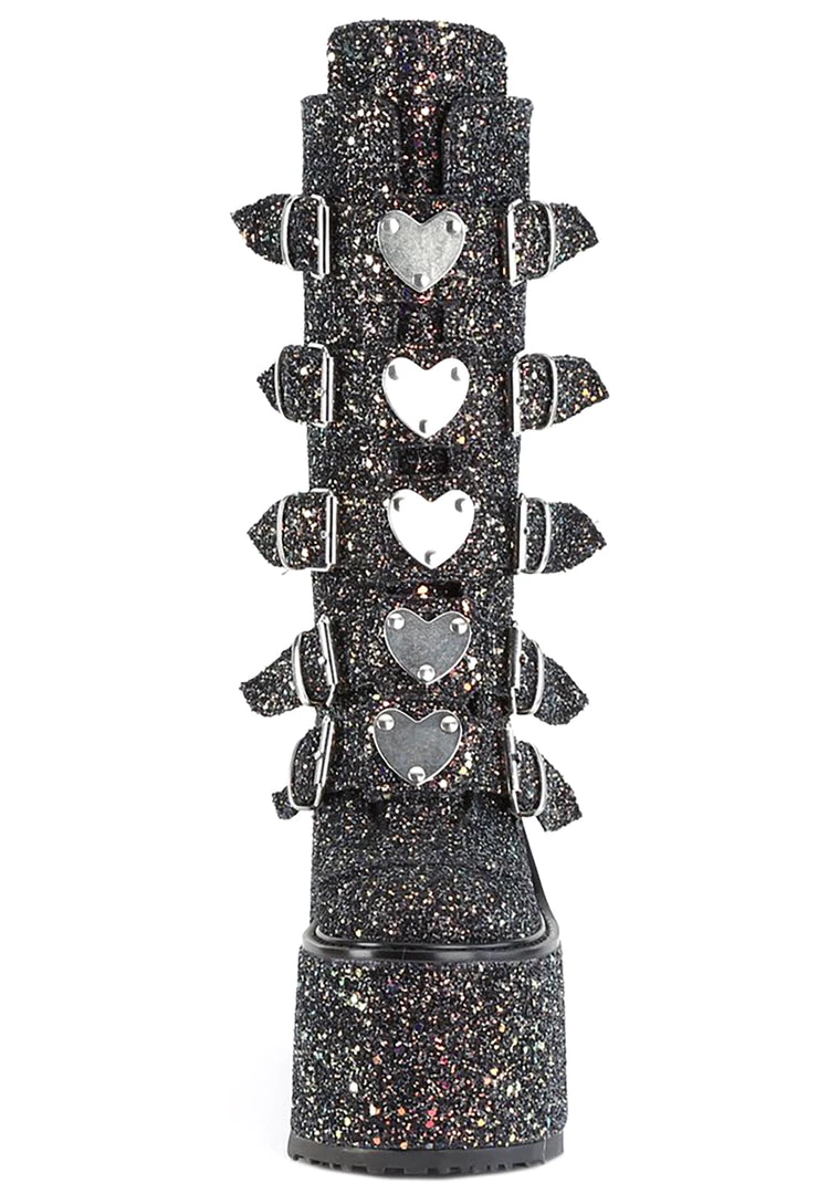 Watch the stars collide in the Supernovae Platform Boots from Demonia. These intergalactic festival platform boots feature a full-on black glitter upper, buckle straps up the front with metal heart plate detailing, and zipper closure up the back. These boots are out of this world.