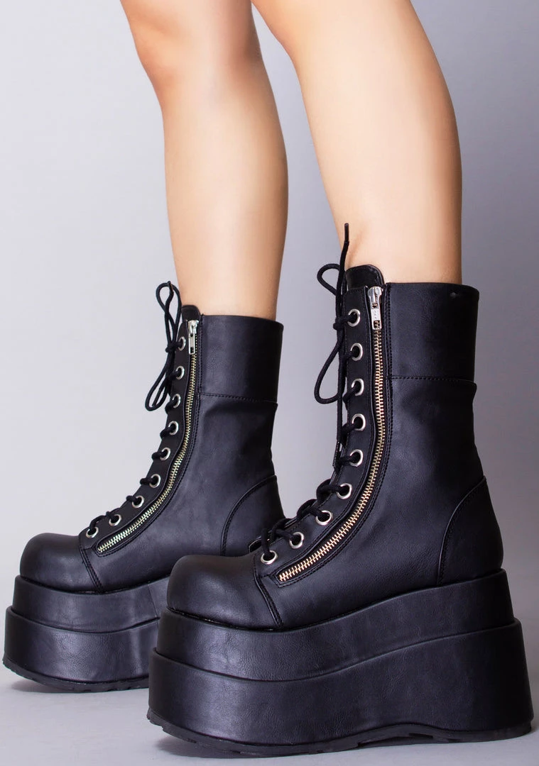 Step into my deviant world when wearing the Twisted Mind Platform Black from Demonia. This insanely sick platform festival boots features a full-on black vegan leather upper with lace up details in the front, silver metal zipper closure on the sides, and extra tall platform heel with traction outsole. Reality check, never!
