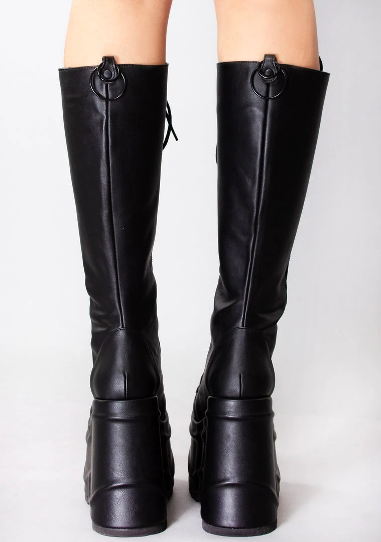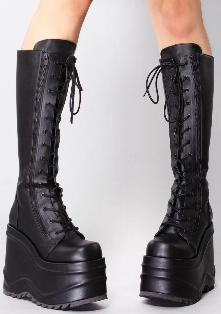 Lose touch with reality in the new Void Walker Platform Boots from Demonia. These minimally cool festival boots feature a vegan leather outer, lace up front, wave debossing on platform, and double metal zippers in the front. #enterthevoid