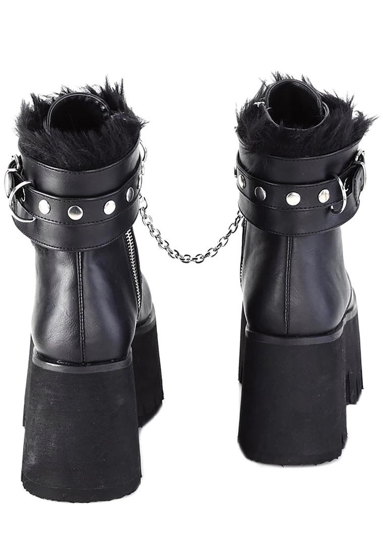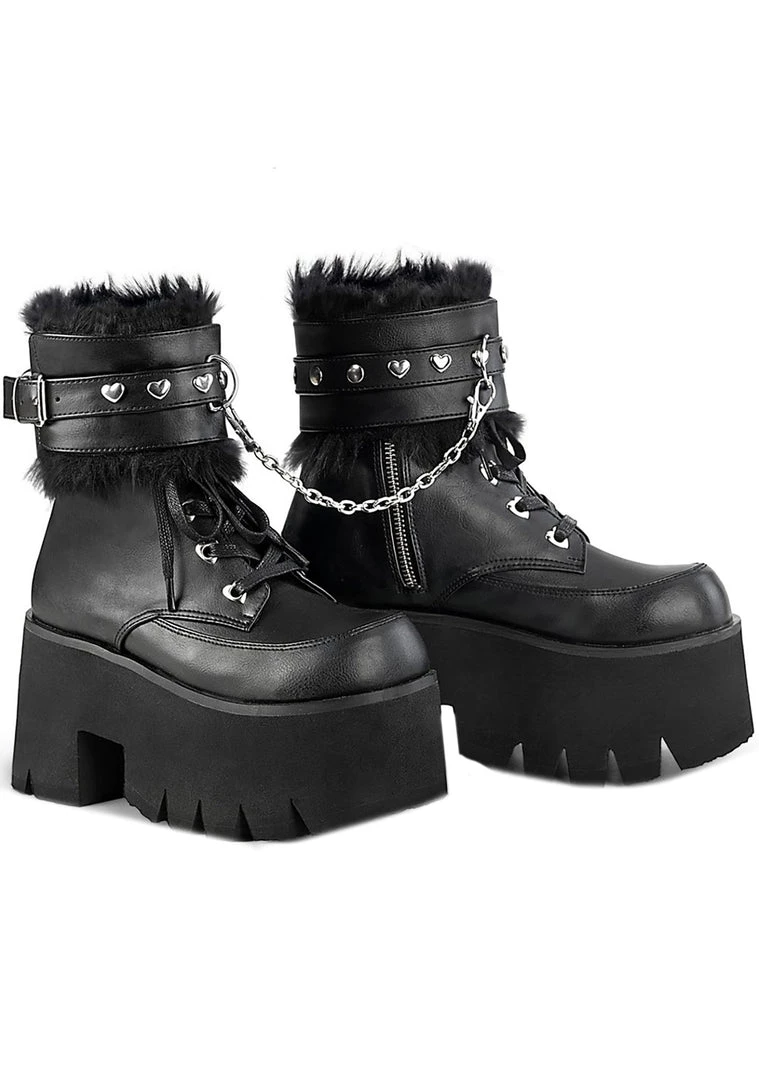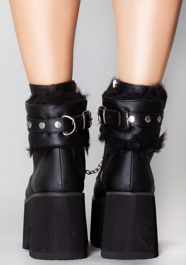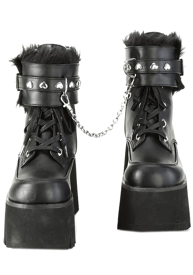 Give them all your love but only for the night in these Wicked Games Platform Boots. These domineering festival boots feature a vegan leather upper, lace-up front, faux fur-lined detachable ankle cuffs, heart studs, and a chain accent. You need all of it to yourself!