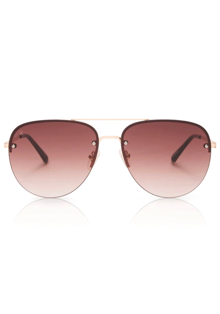 Flex those boss lady vibes in the Cienega Sunglasses from Dine Optics. These super sleek festival rave sunglasses feature a modern aviator style gold tone frame with dual bridge detail, polarized rounded brown fade lenses, dime. brand logo on the stems and X etched right lens. Throw on these cute sunglasses and hustle.