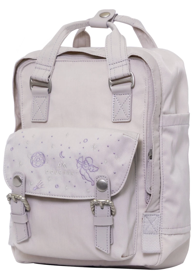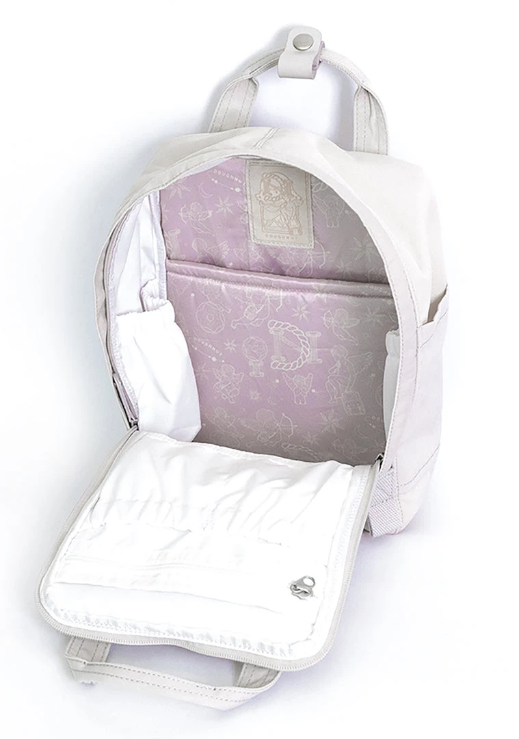 Take a stroll through the heavens with the Grace Series Macaroon Mini Backpack from Doughnut Official. This angelic festival backpack features a stone-colored water-resistant exterior with a large zippered main compartment, front snap buckle pocket, and side pockets, with dual adjustable shoulder straps, and top handles. #blessed
