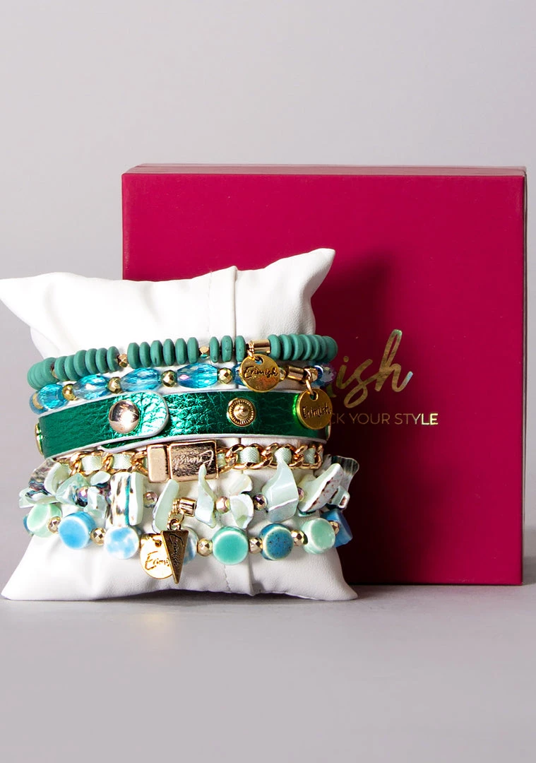 Wave bye to bad vibes with the new Emerald Ice Stack Bracelet from Erimish. This positively bada$$ stack features 6 festival bracelets made with an array of gemstones and beads in various shades of emerald, gold chain, and ribbon accents, and has a geode centerpiece to help bring you clarity and balance. It’s only positive vibes with this stack.