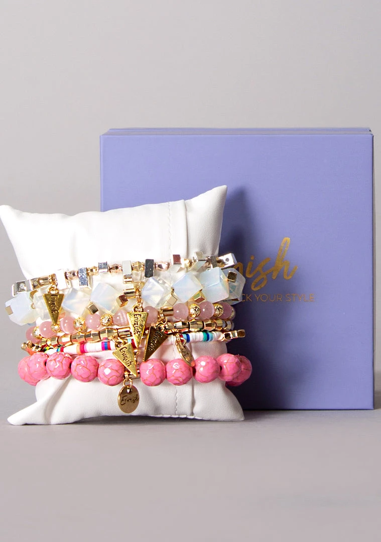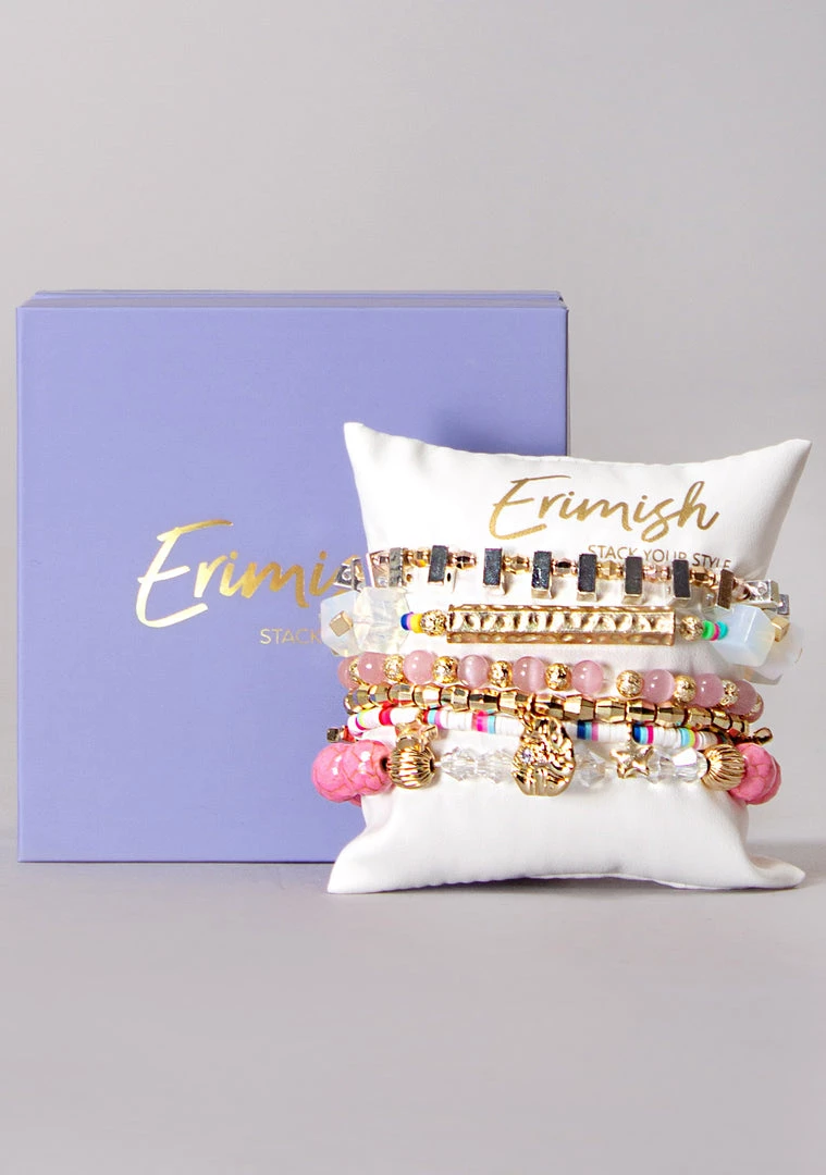 Flaunt your style with the new Pink Cashmere Bracelet Stack from Erimish. This dazzling stack features 6 festival bracelets composed of an array of shells and beads in various shades of pink and opal and is accented with golden charms to add a touch of luxury. They’ll all wish they were you.