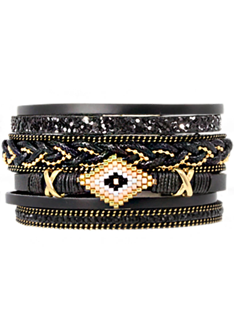 Dance through the darkness when wearing the Erimish Into The Night Multi Strand Bracelet. This mystical punk bracelet is made of lead free metal and features a versatile multi strand design, bewitching black rhinestone accents, arresting braided black and gold detailing, captivating beaded triangle centerpiece and magnetic snap closure. ‘Cuz you always come alive at night.