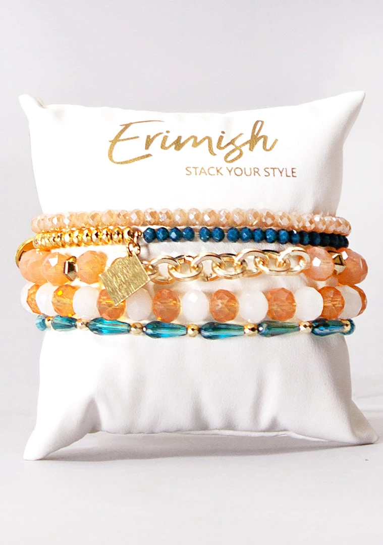Who says brunch is the only time for a bellini? Keep the party going with the Peach Bellini Bracelet Stack from Erimish. This deliciously ripe Festival Bracelet stack features five thirst-quenching bracelets with beads in breathtaking shades of peach, magnificent white, sparkling teal, and twinkling gold. ‘Cuz any time of day is Peach Bellini time
