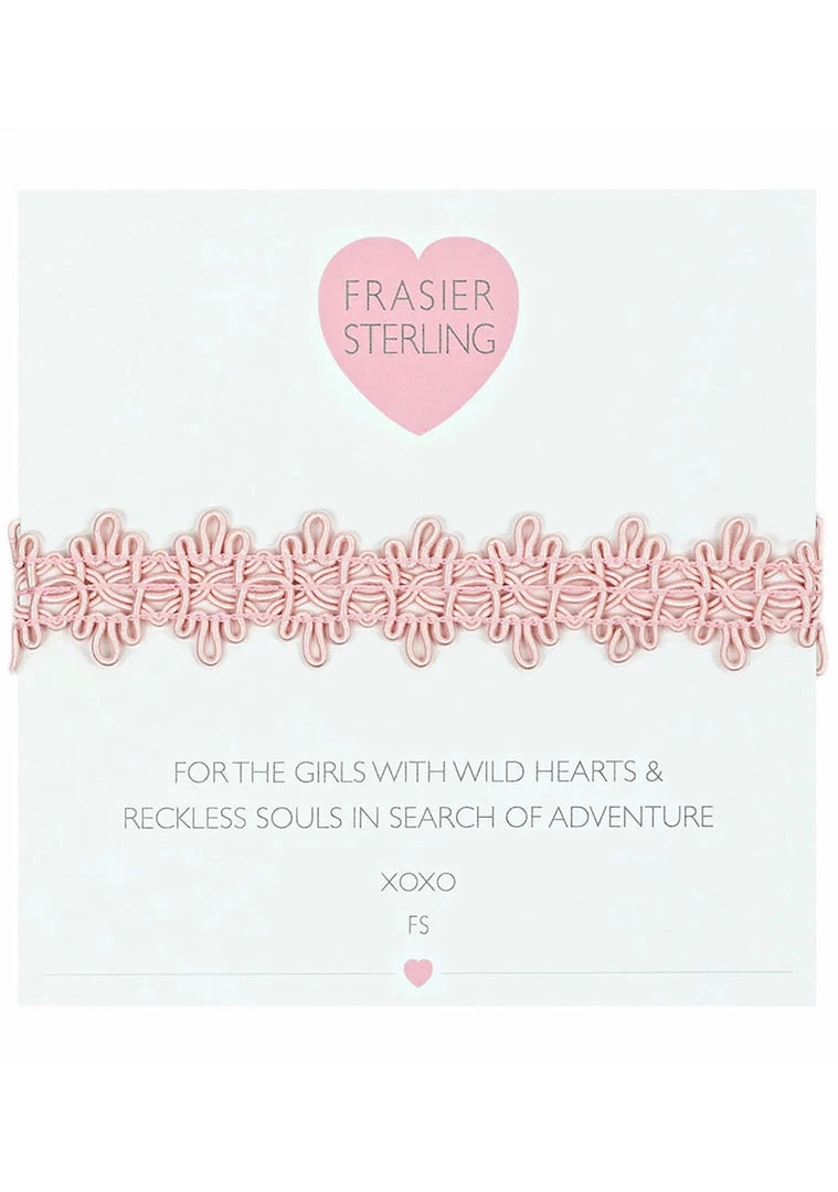 Show off your romantic style with the Zeppelin Choker from Frasier Sterling. This lovely Festival Choker features a pastel pink colored lace choker with gold plated lobster clasp closure.