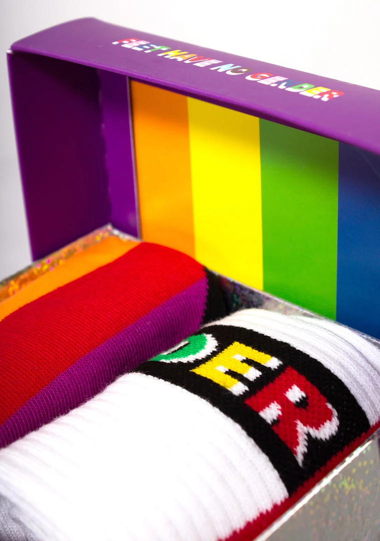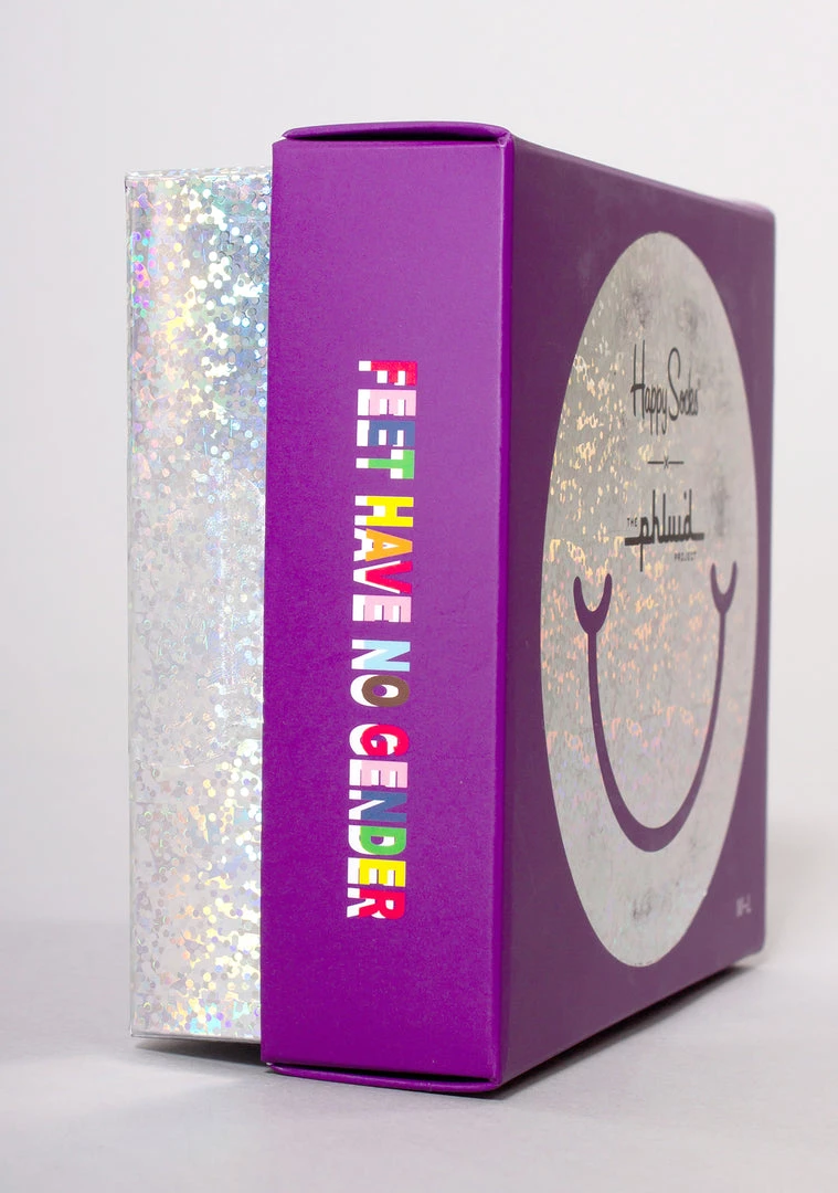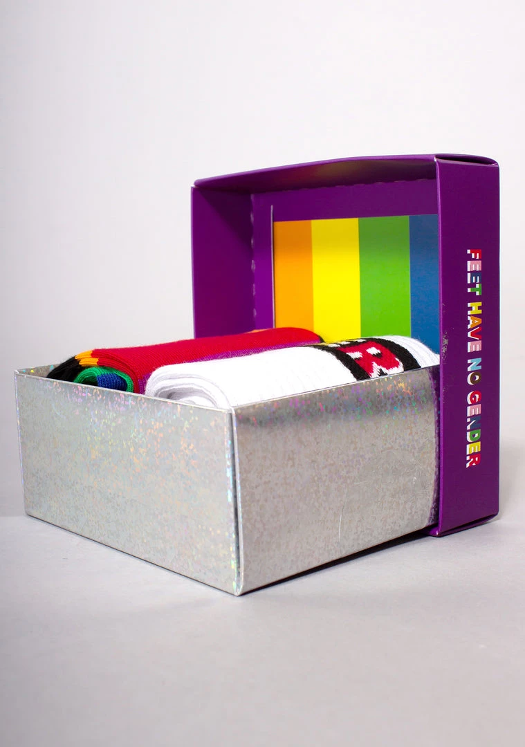 Our feet have no Gender! ONLY VIBES! “Feet Have No Gender” is the mantra of this special collaboration between happy socks and the worlds first gender-free store, The Phluid Project. Wear these party socks with PRIDE!