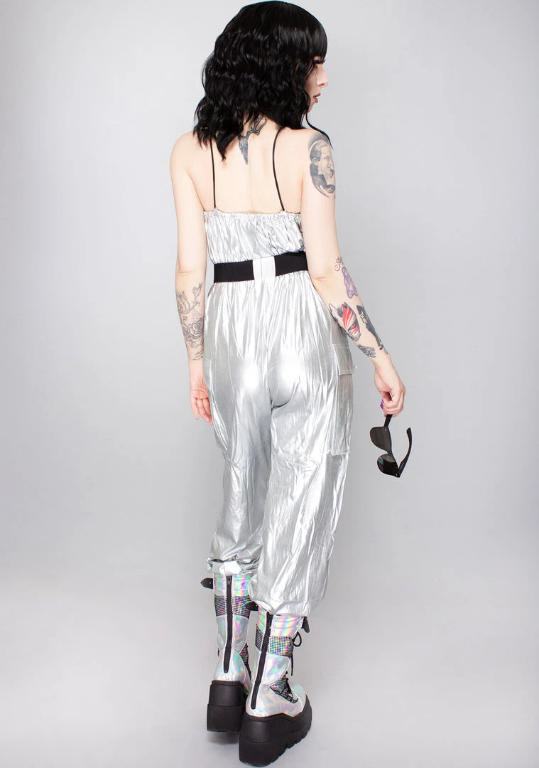 Don’t follow the trends, set them with the new Future Club Buckle Belt Jumpsuit from Hot & Delicious. This new age rave jumpsuit features a metallic silver construction, zip up front, xxtra long belt with clip buckle closure, slip and cargo pockets, and pull cord accents on the straps. #trendsetter