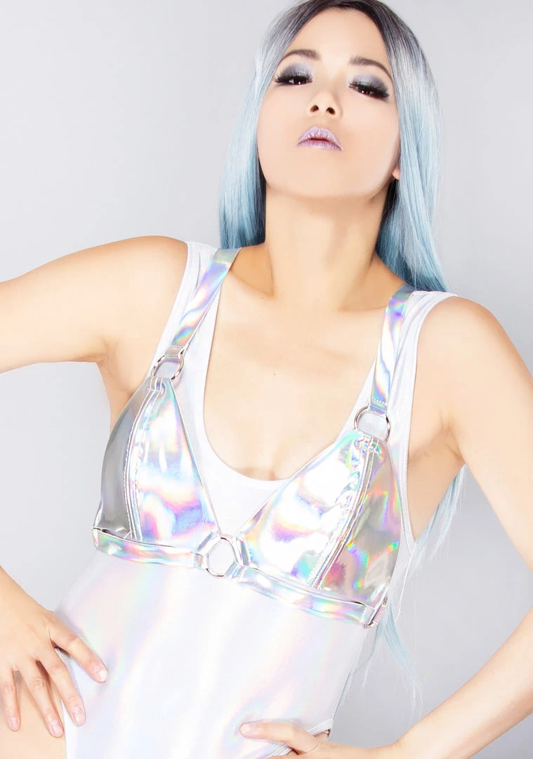 Bring Heaven to Earth with the Galactic Angel Holographic Harness Top from Hot & Delicious. This stellar festival top features an all-holographic harness bralette, back wing details, silver O ring accents, and secure buckle straps. Add this top to your next rave outfit for a completely divine look!