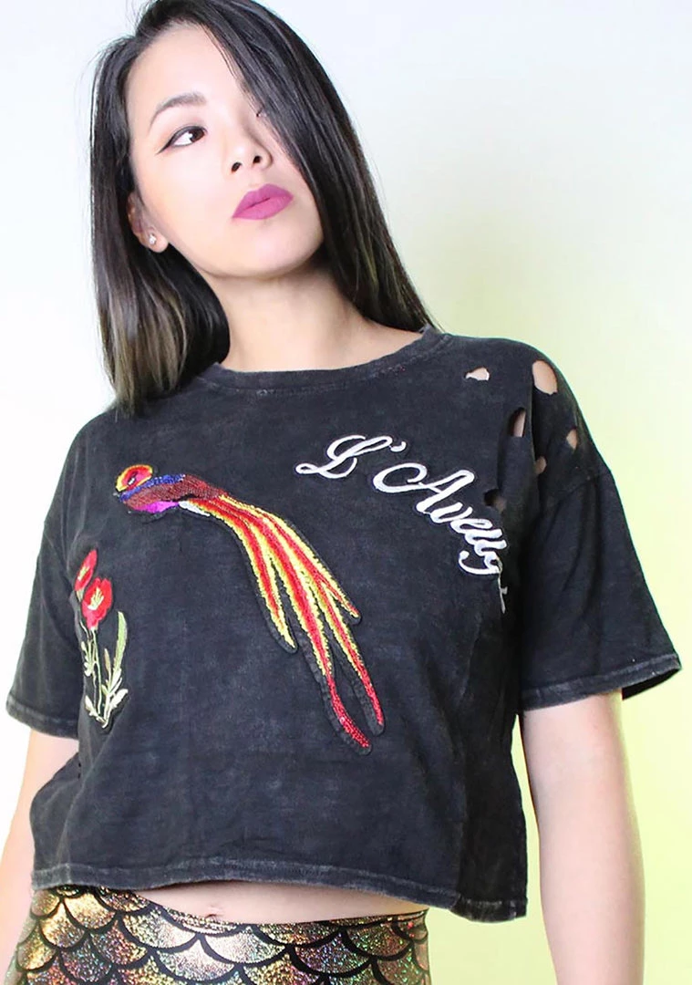 We know you’re ready for a little fun in the sun when you wear the Phoenix Crop Top Tee. This super cute rave t shirts come in a soft polyester/rayon blend for a relaxed look with sequin bird & flower patches on front, distressed detail on shoulder, short sleeves and scoop neckline.
