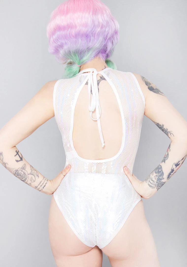 Radiate star power while wearing the Cosmic Starlight Sequin Mesh Bodysuit from J Valentine. These super sexy rave bodysuits feature a sleeveless full-on white mesh with holographic sequin details, cut-out back detail, and a self-tie halter top. With this cute bodysuit, you’ll be an intergalactic star.