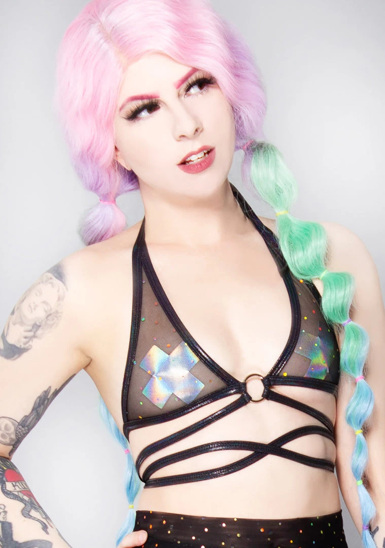 Light up the night while wearing the Mystic Firefly Mesh Ring Wrap Top from J Valentine. These transcendent rave festival tops feature a black base with iridescent sequin, cross wrap straps with o-ring detail, and back tie closure. Now go out there and show them your glow.
