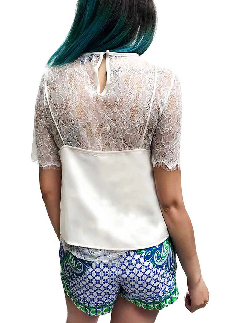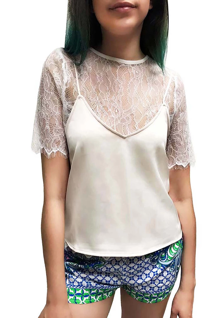 The Delphine Lace top is the perfect outfit for you to grab an afternoon tea with your girls. This lovely festival tops features an all-over white lace top with short sleeve and overlays with a loose fit cream colored tank top. Technically you get two items for a price of one. Good deal isn’t it. Get the same look by pairing this cute top with our Paradise Print Shorts.