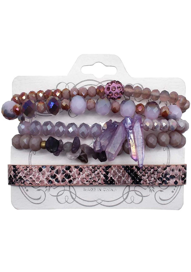 Give any look a luxurious vibe when you wear the gorgeous Lavish Bracelet Set. This Punk Bracelets set features four different lavender colored bracelets made with a mixture of high quality beads, stones, and crystals and one purple python cuff . Stack them up or wear one alone!