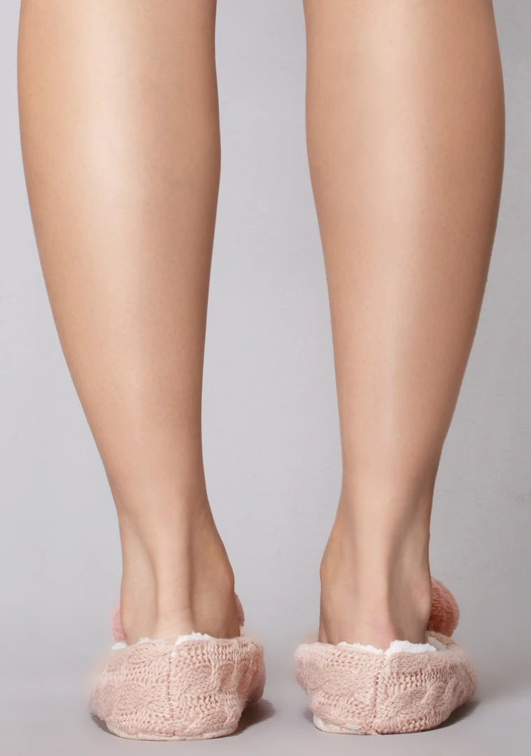 Stay sweater weather ready in the Slay Belle Pom Knit Slippers. These cozy winter slippers feature a sophisticated grey cable knit exterior, classic ballet style silhouette, eye-catching 3D pom accent, decadent faux shearling lining, elasticized gore and non-slip gripped sole. These joyful festival slippers are sure to deck some halls.